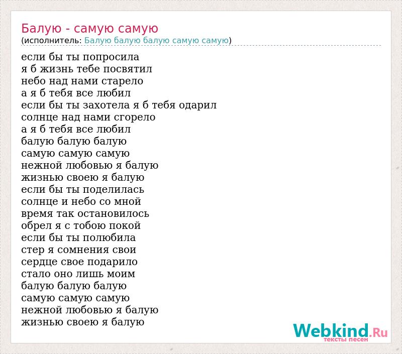 если бы ты попросила я б жизнь тебе посвятил небо над нами старело а я б тебя все любил если бы ты захотела я б тебя одарил солнце над нами сгорело а я б тебя все любил балую балую балую самую самую самую нежной любовью я балую жизнью своею я балую если бы ты поделилась солнце и небо со мной время так остановилось обрел я с тобою покой если бы ты полюбила стер я сомнения свои сердце свое подарило стало оно лишь моим балую балую балую самую самую самую нежной любовью я балую жизнью своею я балую
