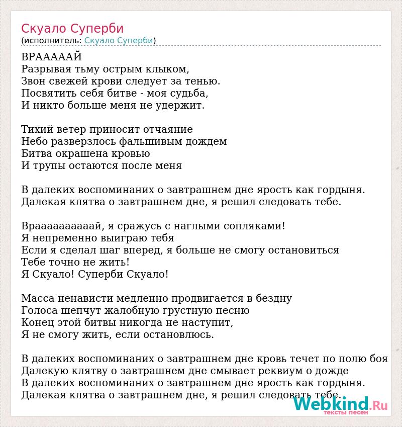 ВРАААААЙ Разрывая тьму острым клыком, Звон свежей крови следует за тенью. Посвятить себя битве - моя судьба, И никто больше меня не удержит. Тихий ветер приносит отчаяние Небо разверзлось фальшивым дождем Битва окрашена кровью И трупы остаются после меня В далеких воспоминаних о завтрашнем дне ярость как гордыня. Далекая клятва о завтрашнем дне, я решил следовать тебе. Враааааааааай, я сражусь с наглыми сопляками! Я непременно выиграю тебя Если я сделал шаг вперед, я больше не смогу остановиться Тебе точно не жить! Я Скуало! Суперби Скуало! Масса ненависти медленно продвигается в бездну Голоса шепчут жалобную грустную песню Конец этой битвы никогда не наступит, Я не смогу жить, если остановлюсь. В далеких воспоминаних о завтрашнем дне кровь течет по полю боя Далекую клятву о завтрашнем дне смывает реквиум о дожде В далеких воспоминаних о завтрашнем дне ярость как гордыня. Далекая клятва о завтрашнем дне, я решил следовать тебе.