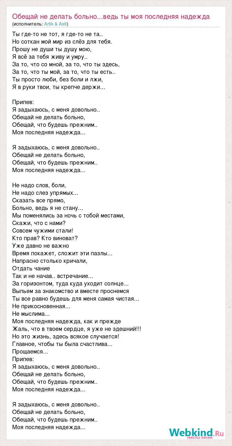 Ты где-то не тот, я где-то не та.. Но соткан мой мир из слёз для тебя. Прошу не души ты душу мою, Я всё за тебя живу и умру.. За то, что со мной, за то, что ты здесь, За то, что ты мой, за то, что ты есть.. Ты просто люби, без боли и лжи, Я в руки твои, ты крепче держи... Припев: Я задыхаюсь, с меня довольно.. Обещай не делать больно, Обещай, что будешь прежним.. Моя последняя надежда... Я задыхаюсь, с меня довольно.. Обещай не делать больно, Обещай, что будешь прежним.. Моя последняя надежда... Не надо слов, боли, Не надо слез упрямых... Сказать все прямо, Больно, ведь я не стану... Мы поменялись за ночь с тобой местами, Скажи, что с нами? Совсем чужими стали! Кто прав? Кто виноват? Уже давно не важно Время покажет, сложит эти пазлы... Напрасно столько кричали, Отдать чание Так и не начав.. встречание... За горизонтом, туда куда уходит солнце... Выпьем за знакомство и вместе проснемся Ты все равно будешь для меня самая чистая... Не прикосновенная... Не мыслима... Моя последняя надежда, как и прежде Жаль, что в твоем сердце, я уже не здешний!!! Но это жизнь, здесь всякое случается! Главное, чтобы ты была счастлива... Прощаемся... Припев: Я задыхаюсь, с меня довольно.. Обещай не делать больно, Обещай, что будешь прежним.. Моя последняя надежда... Я задыхаюсь, с меня довольно.. Обещай не делать больно, Обещай, что будешь прежним.. Моя последняя надежда...