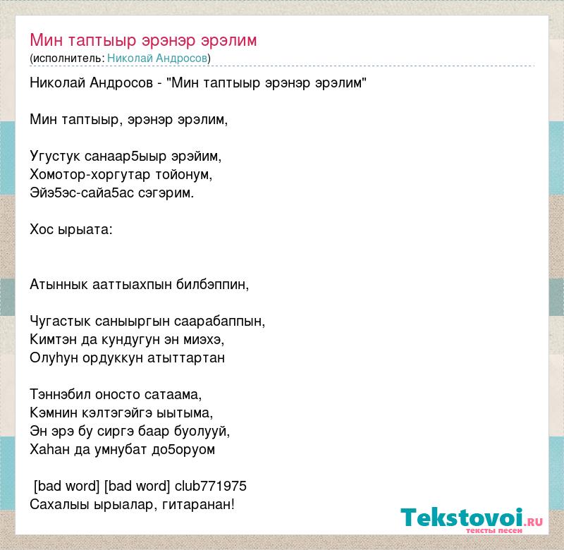 Николай Андросов - "Мин таптыыр эрэнэр эрэлим" Мин таптыыр, эрэнэр эрэлим, Угустук санаар5ыыр эрэйим, Хомотор-хоргутар тойонум, Эйэ5эс-сайа5ас сэгэрим. Хос ырыата: Атыннык ааттыахпын билбэппин, Чугастык саныыргын саарабаппын, Кимтэн да кундугун эн миэхэ, Олуhун ордуккун атыттартан Тэннэбил оносто сатаама, Кэмнин кэлтэгэйгэ ыытыма, Эн эрэ бу сиргэ баар буолууй, Хаhан да умнубат до5оруом [bad word] [bad word] club771975 Сахалыы ырыалар, гитаранан!