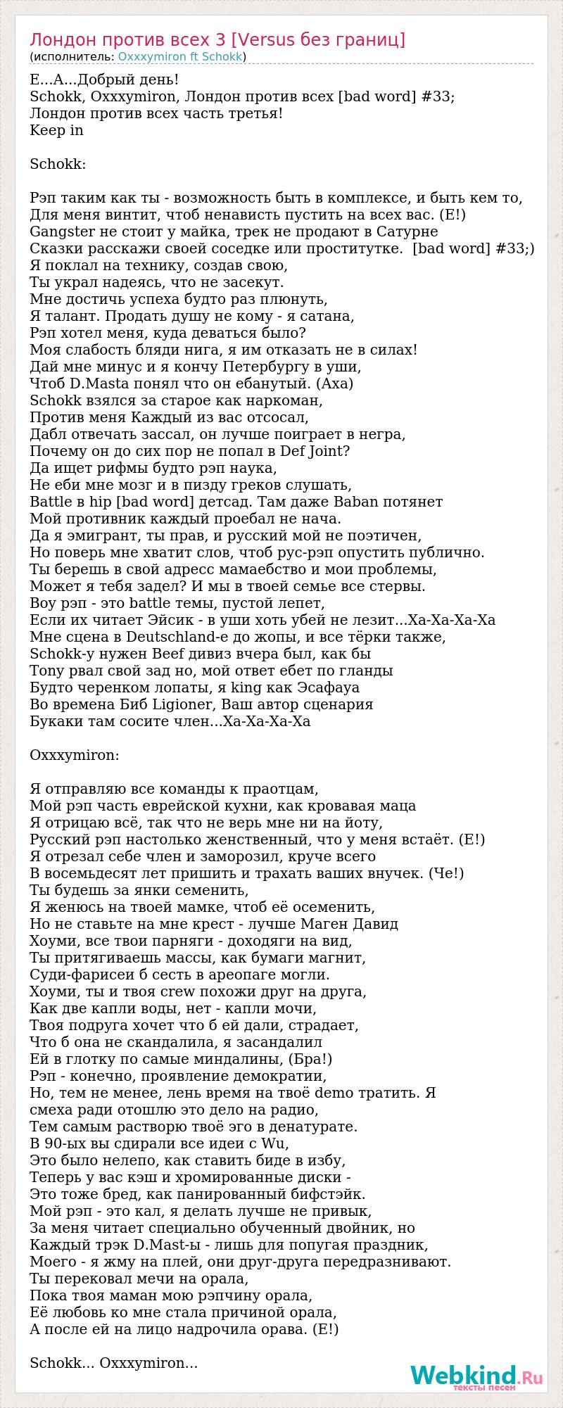 Е...А...Добрый день! Schokk, Oxxxymiron, Лондон против всех [bad word] #33; Лондон против всех часть третья! Keep in Schokk: Рэп таким как ты - возможность быть в комплексе, и быть кем то, Для меня винтит, чтоб ненависть пустить на всех вас. (Е!) Gangster не стоит у майка, трек не продают в Сатурне Сказки расскажи своей соседке или проститутке. [bad word] #33;) Я поклал на технику, создав свою, Ты украл надеясь, что не засекут. Мне достичь успеха будто раз плюнуть, Я талант. Продать душу не кому - я сатана, Рэп хотел меня, куда деваться было? Моя слабость бляди нига, я им отказать не в силах! Дай мне минус и я кончу Петербургу в уши, Чтоб D.Masta понял что он ебанутый. (Аха) Schokk взялся за старое как наркоман, Против меня Каждый из вас отсосал, Дабл отвечать зассал, он лучше поиграет в негра, Почему он до сих пор не попал в Def Joint? Да ищет рифмы будто рэп наука, Не еби мне мозг и в пизду греков слушать, Battle в hip [bad word] детсад. Там даже Baban потянет Мой противник каждый проебал не нача. Да я эмигрант, ты прав, и русский мой не поэтичен, Но поверь мне хватит слов, чтоб рус-рэп опустить публично. Ты берешь в свой адресс мамаебство и мои проблемы, Может я тебя задел? И мы в твоей семье все стервы. Boy рэп - это battle темы, пустой лепет, Если их читает Эйсик - в уши хоть убей не лезит...Ха-Ха-Ха-Ха Мне сцена в Deutschland-е до жопы, и все тёрки также, Schokk-у нужен Beef дивиз вчера был, как бы Tony рвал свой зад но, мой ответ ебет по гланды Будто черенком лопаты, я king как Эсафауа Во времена Биб Ligioner, Ваш автор сценария Букаки там сосите член...Ха-Ха-Ха-Ха Oxxxymiron: Я отправляю все команды к праотцам, Мой рэп часть еврейской кухни, как кровавая маца Я отрицаю всё, так что не верь мне ни на йоту, Русский рэп настолько женственный, что у меня встаёт. (Е!) Я отрезал себе член и заморозил, круче всего В восемьдесят лет пришить и трахать ваших внучек. (Че!) Ты будешь за янки семенить, Я женюсь на твоей мамке, чтоб её осеменить, Но не ставьте на мне крест - лучше Маген Давид Хоуми, все твои парняги - доходяги на вид, Ты притягиваешь массы, как бумаги магнит, Суди-фарисеи б сесть в ареопаге могли. Хоуми, ты и твоя crew похожи друг на друга, Как две капли воды, нет - капли мочи, Твоя подруга хочет что б ей дали, страдает, Что б она не скандалила, я засандалил Ей в глотку по самые миндалины, (Бра!) Рэп - конечно, проявление демократии, Но, тем не менее, лень время на твоё demo тратить. Я смеха ради отошлю это дело на радио, Тем самым растворю твоё эго в денатурате. В 90-ых вы сдирали все идеи с Wu, Это было нелепо, как ставить биде в избу, Теперь у вас кэш и хромированные диски - Это тоже бред, как панированный бифстэйк. Мой рэп - это кал, я делать лучше не привык, За меня читает специально обученный двойник, но Каждый трэк D.Mast-ы - лишь для попугая праздник, Моего - я жму на плей, они друг-друга передразнивают. Ты перековал мечи на орала, Пока твоя маман мою рэпчину орала, Её любовь ко мне стала причиной орала, А после ей на лицо надрочила орава. (Е!) Schokk... Oxxxymiron...