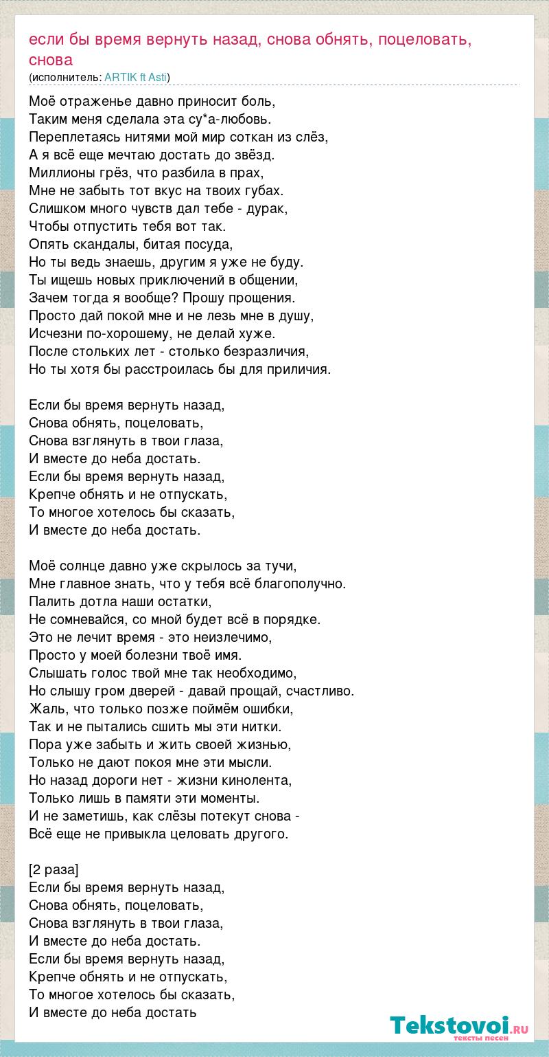 Моё отраженье давно приносит боль, Таким меня сделала эта су*а-любовь. Переплетаясь нитями мой мир соткан из слёз, А я всё еще мечтаю достать до звёзд. Миллионы грёз, что разбила в прах, Мне не забыть тот вкус на твоих губах. Слишком много чувств дал тебе - дурак, Чтобы отпустить тебя вот так. Опять скандалы, битая посуда, Но ты ведь знаешь, другим я уже не буду. Ты ищешь новых приключений в общении, Зачем тогда я вообще? Прошу прощения. Просто дай покой мне и не лезь мне в душу, Исчезни по-хорошему, не делай хуже. После стольких лет - столько безразличия, Но ты хотя бы расстроилась бы для приличия. Если бы время вернуть назад, Снова обнять, поцеловать, Снова взглянуть в твои глаза, И вместе до неба достать. Если бы время вернуть назад, Крепче обнять и не отпускать, То многое хотелось бы сказать, И вместе до неба достать. Моё солнце давно уже скрылось за тучи, Мне главное знать, что у тебя всё благополучно. Палить дотла наши остатки, Не сомневайся, со мной будет всё в порядке. Это не лечит время - это неизлечимо, Просто у моей болезни твоё имя. Слышать голос твой мне так необходимо, Но слышу гром дверей - давай прощай, счастливо. Жаль, что только позже поймём ошибки, Так и не пытались сшить мы эти нитки. Пора уже забыть и жить своей жизнью, Только не дают покоя мне эти мысли. Но назад дороги нет - жизни кинолента, Только лишь в памяти эти моменты. И не заметишь, как слёзы потекут снова - Всё еще не привыкла целовать другого. [2 раза] Если бы время вернуть назад, Снова обнять, поцеловать, Снова взглянуть в твои глаза, И вместе до неба достать. Если бы время вернуть назад, Крепче обнять и не отпускать, То многое хотелось бы сказать, И вместе до неба достать