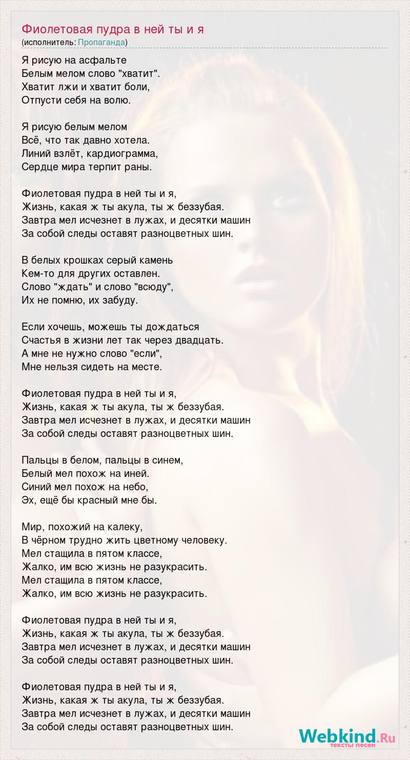 Я рисую на асфальте Белым мелом слово "хватит". Хватит лжи и хватит боли, Отпусти себя на волю. Я рисую белым мелом Всё, что так давно хотела. Линий взлёт, кардиограмма, Сердце мира терпит раны. Фиолетовая пудра в ней ты и я, Жизнь, какая ж ты акула, ты ж беззубая. Завтра мел исчезнет в лужах, и десятки машин За собой следы оставят разноцветных шин. В белых крошках серый камень Кем-то для других оставлен. Слово "ждать" и слово "всюду", Их не помню, их забуду. Если хочешь, можешь ты дождаться Счастья в жизни лет так через двадцать. А мне не нужно слово "если", Мне нельзя сидеть на месте. Фиолетовая пудра в ней ты и я, Жизнь, какая ж ты акула, ты ж беззубая. Завтра мел исчезнет в лужах, и десятки машин За собой следы оставят разноцветных шин. Пальцы в белом, пальцы в синем, Белый мел похож на иней. Синий мел похож на небо, Эх, ещё бы красный мне бы. Мир, похожий на калеку, В чёрном трудно жить цветному человеку. Мел стащила в пятом классе, Жалко, им всю жизнь не разукрасить. Мел стащила в пятом классе, Жалко, им всю жизнь не разукрасить. Фиолетовая пудра в ней ты и я, Жизнь, какая ж ты акула, ты ж беззубая. Завтра мел исчезнет в лужах, и десятки машин За собой следы оставят разноцветных шин. Фиолетовая пудра в ней ты и я, Жизнь, какая ж ты акула, ты ж беззубая. Завтра мел исчезнет в лужах, и десятки машин За собой следы оставят разноцветных шин.