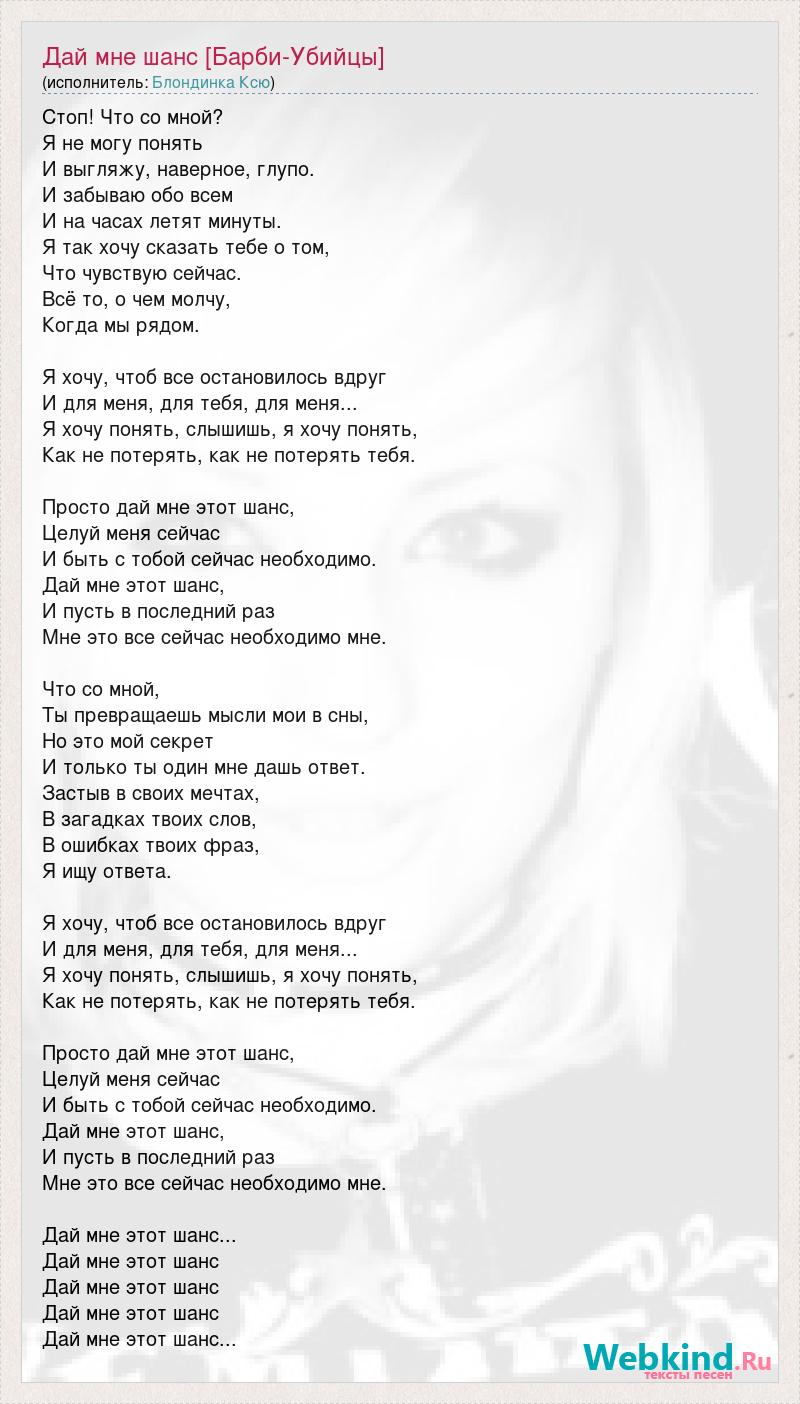 Стоп! Что со мной? Я не могу понять И выгляжу, наверное, глупо. И забываю обо всем И на часах летят минуты. Я так хочу сказать тебе о том, Что чувствую сейчас. Всё то, о чем молчу, Когда мы рядом. Я хочу, чтоб все остановилось вдруг И для меня, для тебя, для меня... Я хочу понять, слышишь, я хочу понять, Как не потерять, как не потерять тебя. Просто дай мне этот шанс, Целуй меня сейчас И быть с тобой сейчас необходимо. Дай мне этот шанс, И пусть в последний раз Мне это все сейчас необходимо мне. Что со мной, Ты превращаешь мысли мои в сны, Но это мой секрет И только ты один мне дашь ответ. Застыв в своих мечтах, В загадках твоих слов, В ошибках твоих фраз, Я ищу ответа. Я хочу, чтоб все остановилось вдруг И для меня, для тебя, для меня... Я хочу понять, слышишь, я хочу понять, Как не потерять, как не потерять тебя. Просто дай мне этот шанс, Целуй меня сейчас И быть с тобой сейчас необходимо. Дай мне этот шанс, И пусть в последний раз Мне это все сейчас необходимо мне. Дай мне этот шанс... Дай мне этот шанс Дай мне этот шанс Дай мне этот шанс Дай мне этот шанс...
