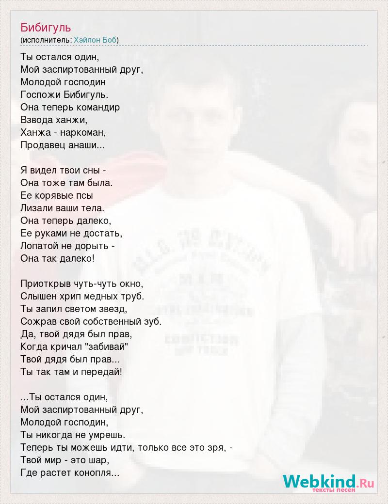 Ты остался один, Мой заспиртованный друг, Молодой господин Госпожи Бибигуль. Она теперь командир Взвода ханжи, Ханжа - наркоман, Продавец анаши... Я видел твои сны - Она тоже там была. Ее корявые псы Лизали ваши тела. Она теперь далеко, Ее руками не достать, Лопатой не дорыть - Она так далеко! Приоткрыв чуть-чуть окно, Слышен хрип медных труб. Ты запил светом звезд, Сожрав свой собственный зуб. Да, твой дядя был прав, Когда кричал "забивай" Твой дядя был прав... Ты так там и передай! ...Ты остался один, Мой заспиртованный друг, Молодой господин, Ты никогда не умрешь. Теперь ты можешь идти, только все это зря, - Твой мир - это шар, Где растет конопля...