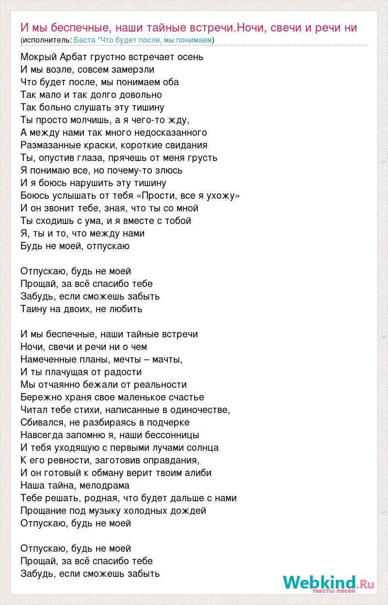 Мокрый Арбат грустно встречает осень И мы возле, совсем замерзли Что будет после, мы понимаем оба Так мало и так долго довольно Так больно слушать эту тишину Ты просто молчишь, а я чего-то жду, А между нами так много недосказанного Размазанные краски, короткие свидания Ты, опустив глаза, прячешь от меня грусть Я понимаю все, но почему-то злюсь И я боюсь нарушить эту тишину Боюсь услышать от тебя «Прости, все я ухожу» И он звонит тебе, зная, что ты со мной Ты сходишь с ума, и я вместе с тобой Я, ты и то, что между нами Будь не моей, отпускаю Отпускаю, будь не моей Прощай, за всё спасибо тебе Забудь, если сможешь забыть Таину на двоих, не любить И мы беспечные, наши тайные встречи Ночи, свечи и речи ни о чем Намеченные планы, мечты – мачты, И ты плачущая от радости Мы отчаянно бежали от реальности Бережно храня свое маленькое счастье Читал тебе стихи, написанные в одиночестве, Сбивался, не разбираясь в подчерке Навсегда запомню я, наши бессонницы И тебя уходящую с первыми лучами солнца К его ревности, заготовив оправдания, И он готовый к обману верит твоим алиби Наша тайна, мелодрама Тебе решать, родная, что будет дальше с нами Прощание под музыку холодных дождей Отпускаю, будь не моей Отпускаю, будь не моей Прощай, за всё спасибо тебе Забудь, если сможешь забыть