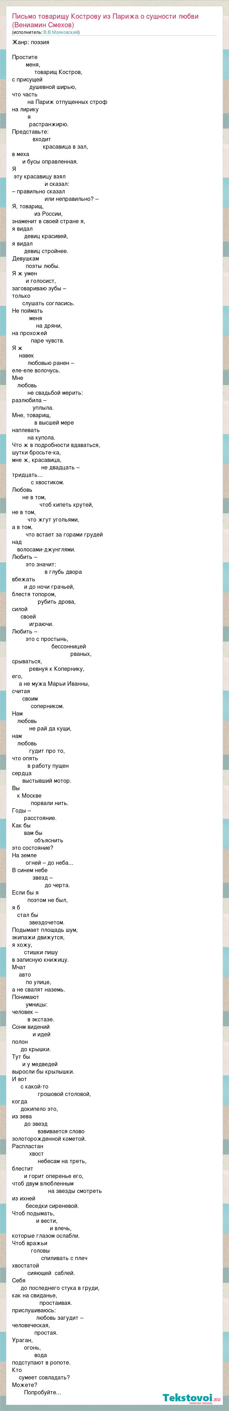 Письмо товарищу Кострову из Парижа о сущности любви (Вениамин Смехов)