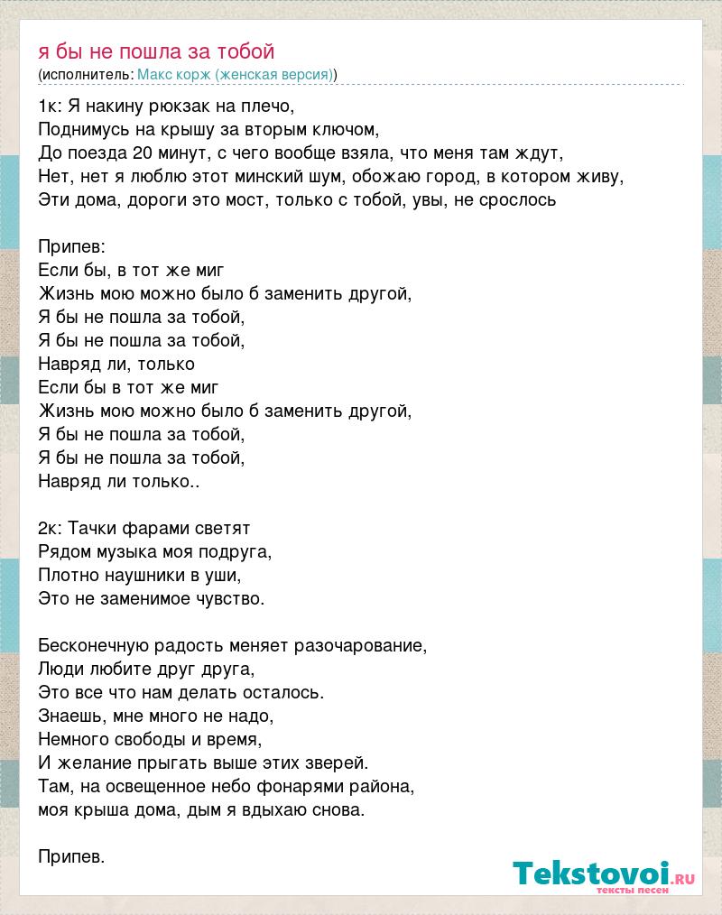 1к: Я накину рюкзак на плечо, Поднимусь на крышу за вторым ключом, До поезда 20 минут, с чего вообще взяла, что меня там ждут, Нет, нет я люблю этот минский шум, обожаю город, в котором живу, Эти дома, дороги это мост, только с тобой, увы, не срослось Припев: Если бы, в тот же миг Жизнь мою можно было б заменить другой, Я бы не пошла за тобой, Я бы не пошла за тобой, Навряд ли, только Если бы в тот же миг Жизнь мою можно было б заменить другой, Я бы не пошла за тобой, Я бы не пошла за тобой, Навряд ли только.. 2к: Тачки фарами светят Рядом музыка моя подруга, Плотно наушники в уши, Это не заменимое чувство. Бесконечную радость меняет разочарование, Люди любите друг друга, Это все что нам делать осталось. Знаешь, мне много не надо, Немного свободы и время, И желание прыгать выше этих зверей. Там, на освещенное небо фонарями района, моя крыша дома, дым я вдыхаю снова. Припев.