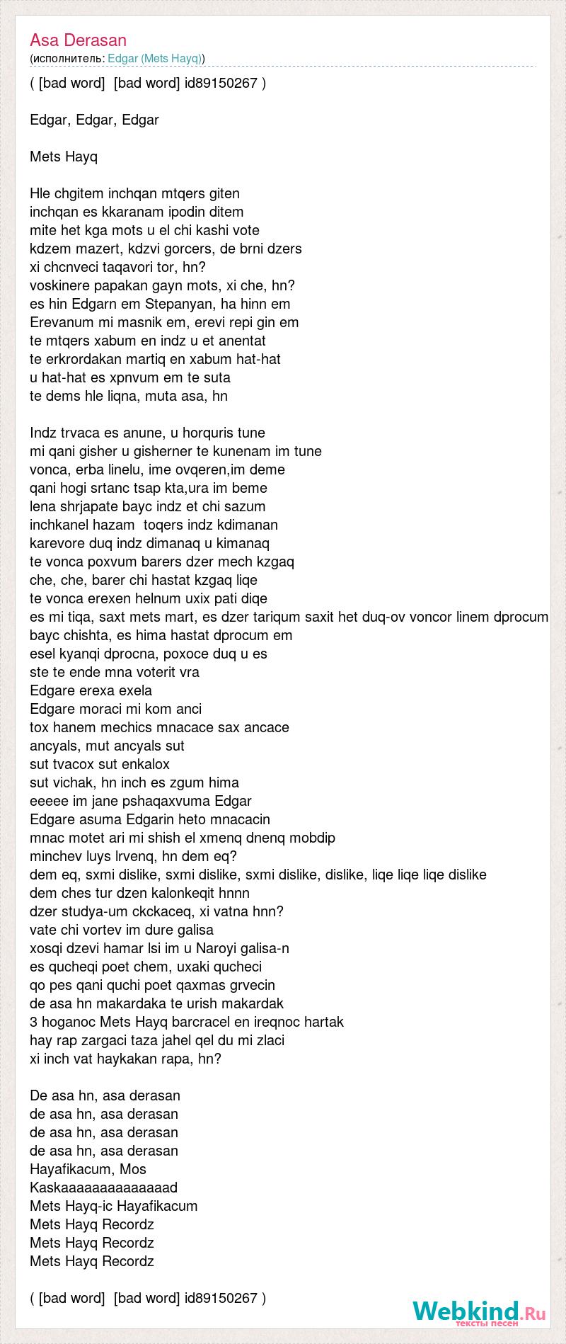( [bad word] [bad word] id89150267 ) Edgar, Edgar, Edgar Mets Hayq Hle chgitem inchqan mtqers giten inchqan es kkaranam ipodin ditem mite het kga mots u el chi kashi vote kdzem mazert, kdzvi gorcers, de brni dzers xi chcnveci taqavori tor, hn? voskinere papakan gayn mots, xi che, hn? es hin Edgarn em Stepanyan, ha hinn em Erevanum mi masnik em, erevi repi gin em te mtqers xabum en indz u et anentat te erkrordakan martiq en xabum hat-hat u hat-hat es xpnvum em te suta te dems hle liqna, muta asa, hn Indz trvaca es anune, u horquris tune mi qani gisher u gisherner te kunenam im tune vonca, erba linelu, ime ovqeren,im deme qani hogi srtanc tsap kta,ura im beme lena shrjapate bayc indz et chi sazum inchkanel hazam toqers indz kdimanan karevore duq indz dimanaq u kimanaq te vonca poxvum barers dzer mech kzgaq che, che, barer chi hastat kzgaq liqe te vonca erexen helnum uxix pati diqe es mi tiqa, saxt mets mart, es dzer tariqum saxit het duq-ov voncor linem dprocum bayc chishta, es hima hastat dprocum em esel kyanqi dprocna, poxoce duq u es ste te ende mna voterit vra Edgare erexa exela Edgare moraci mi kom anci tox hanem mechics mnacace sax ancace ancyals, mut ancyals sut sut tvacox sut enkalox sut vichak, hn inch es zgum hima eeeee im jane pshaqaxvuma Edgar Edgare asuma Edgarin heto mnacacin mnac motet ari mi shish el xmenq dnenq mobdip minchev luys lrvenq, hn dem eq? dem eq, sxmi dislike, sxmi dislike, sxmi dislike, dislike, liqe liqe liqe dislike dem ches tur dzen kalonkeqit hnnn dzer studya-um ckckaceq, xi vatna hnn? vate chi vortev im dure galisa xosqi dzevi hamar lsi im u Naroyi galisa-n es qucheqi poet chem, uxaki qucheci qo pes qani quchi poet qaxmas grvecin de asa hn makardaka te urish makardak 3 hoganoc Mets Hayq barcracel en ireqnoc hartak hay rap zargaci taza jahel qel du mi zlaci xi inch vat haykakan rapa, hn? De asa hn, asa derasan de asa hn, asa derasan de asa hn, asa derasan de asa hn, asa derasan Hayafikacum, Mos Kaskaaaaaaaaaaaaaad Mets Hayq-ic Hayafikacum Mets Hayq Recordz Mets Hayq Recordz Mets Hayq Recordz ( [bad word] [bad word] id89150267 )