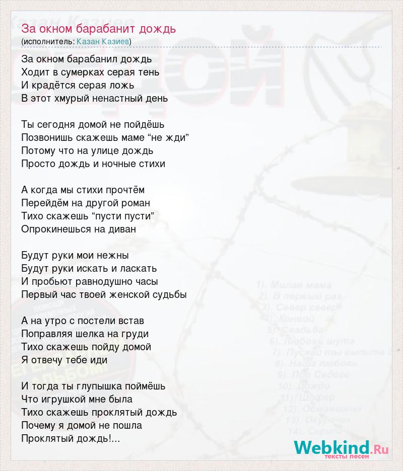 За окном барабанил дождь Ходит в сумерках серая тень И крадётся серая ложь В этот хмурый ненастный день Ты сегодня домой не пойдёшь Позвонишь скажешь маме “не жди” Потому что на улице дождь Просто дождь и ночные стихи А когда мы стихи прочтём Перейдём на другой роман Тихо скажешь “пусти пусти” Опрокинешься на диван Будут руки мои нежны Будут руки искать и ласкать И пробьют равнодушно часы Первый час твоей женской судьбы А на утро с постели встав Поправляя шелка на груди Тихо скажешь пойду домой Я отвечу тебе иди И тогда ты глупышка поймёшь Что игрушкой мне была Тихо скажешь проклятый дождь Почему я домой не пошла Проклятый дождь!...