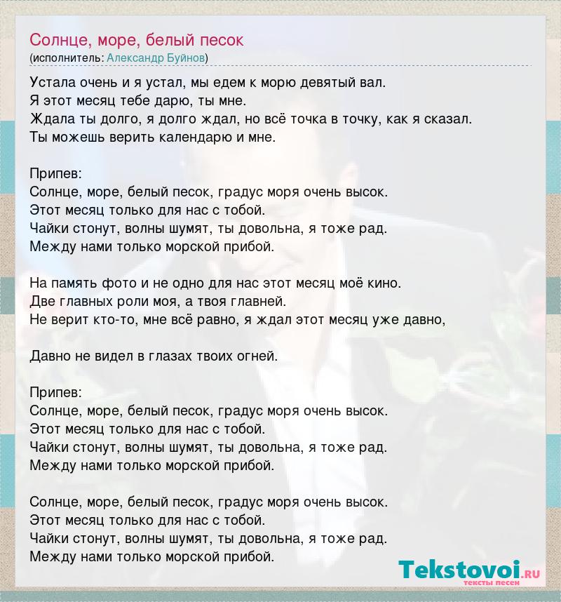 Устала очень и я устал, мы едем к морю девятый вал. Я этот месяц тебе дарю, ты мне. Ждала ты долго, я долго ждал, но всё точка в точку, как я сказал. Ты можешь верить календарю и мне. Припев: Солнце, море, белый песок, градус моря очень высок. Этот месяц только для нас с тобой. Чайки стонут, волны шумят, ты довольна, я тоже рад. Между нами только морской прибой. На память фото и не одно для нас этот месяц моё кино. Две главных роли моя, а твоя главней. Не верит кто-то, мне всё равно, я ждал этот месяц уже давно, Давно не видел в глазах твоих огней. Припев: Солнце, море, белый песок, градус моря очень высок. Этот месяц только для нас с тобой. Чайки стонут, волны шумят, ты довольна, я тоже рад. Между нами только морской прибой. Солнце, море, белый песок, градус моря очень высок. Этот месяц только для нас с тобой. Чайки стонут, волны шумят, ты довольна, я тоже рад. Между нами только морской прибой.