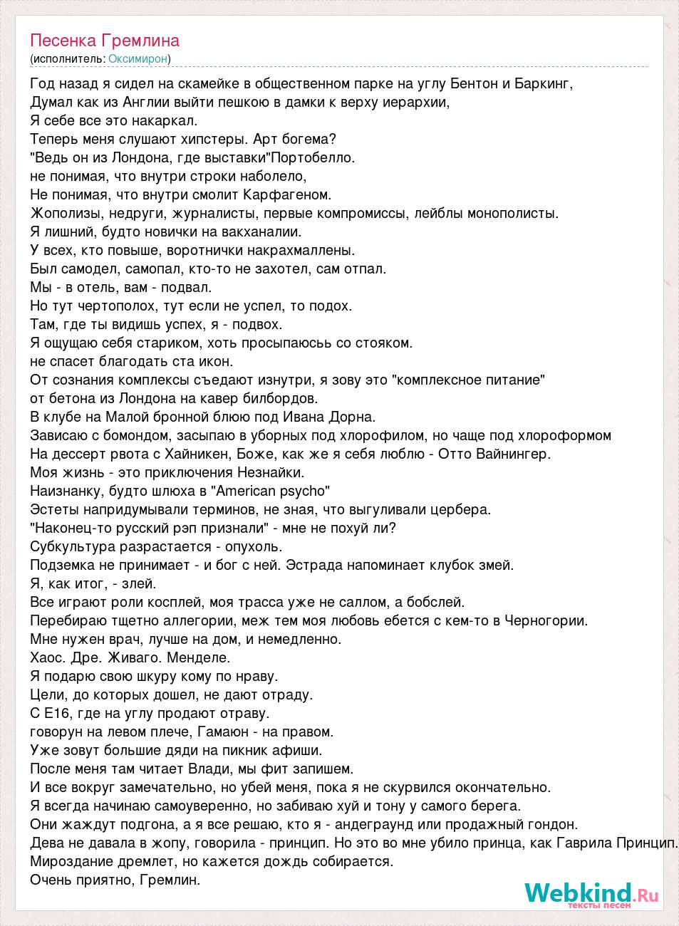 Год назад я сидел на скамейке в общественном парке на углу Бентон и Баркинг, Думал как из Англии выйти пешкою в дамки к верху иерархии, Я себе все это накаркал. Теперь меня слушают хипстеры. Арт богема? "Ведь он из Лондона, где выставки"Портобелло. не понимая, что внутри строки наболело, Не понимая, что внутри смолит Карфагеном. Жополизы, недруги, журналисты, первые компромиссы, лейблы монополисты. Я лишний, будто новички на вакханалии. У всех, кто повыше, воротнички накрахмаллены. Был самодел, самопал, кто-то не захотел, сам отпал. Мы - в отель, вам - подвал. Но тут чертополох, тут если не успел, то подох. Там, где ты видишь успех, я - подвох. Я ощущаю себя стариком, хоть просыпаюсьь со стояком. не спасет благодать ста икон. От сознания комплексы съедают изнутри, я зову это "комплексное питание" от бетона из Лондона на кавер билбордов. В клубе на Малой бронной блюю под Ивана Дорна. Зависаю с бомондом, засыпаю в уборных под хлорофилом, но чаще под хлороформом На дессерт рвота с Хайникен, Боже, как же я себя люблю - Отто Вайнингер. Моя жизнь - это приключения Незнайки. Наизнанку, будто шлюха в "American psycho" Эстеты напридумывали терминов, не зная, что выгуливали цербера. "Наконец-то русский рэп признали" - мне не похуй ли? Субкультура разрастается - опухоль. Подземка не принимает - и бог с ней. Эстрада напоминает клубок змей. Я, как итог, - злей. Все играют роли косплей, моя трасса уже не саллом, а бобслей. Перебираю тщетно аллегории, меж тем моя любовь ебется с кем-то в Черногории. Мне нужен врач, лучше на дом, и немедленно. Хаос. Дре. Живаго. Менделе. Я подарю свою шкуру кому по нраву. Цели, до которых дошел, не дают отраду. С Е16, где на углу продают отраву. говорун на левом плече, Гамаюн - на правом. Уже зовут большие дяди на пикник афиши. После меня там читает Влади, мы фит запишем. И все вокруг замечательно, но убей меня, пока я не скурвился окончательно. Я всегда начинаю самоуверенно, но забиваю хуй и тону у самого берега. Они жаждут подгона, а я все решаю, кто я - андеграунд или продажный гондон. Дева не давала в жопу, говорила - принцип. Но это во мне убило принца, как Гаврила Принцип. Мироздание дремлет, но кажется дождь собирается. Очень приятно, Гремлин.