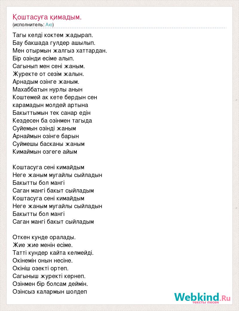 Тагы келдi коктем жадырап. Бау бакшада гулдер ашылып. Мен отырмын жалгыз хаттардан. Бiр озiнди есiме алып. Сагынып мен сенi жаным. Журекте от сезiм жалын. Арнадым озiнге жаным. Махаббатын нурлы анын Коштемей ак кете бердын сен карамадын молдей артына Бакыттымын тек санар едiн Кездесен ба озiнмен тагыда Суйемын озiндi жаным Арнаймын озiнге барын Суймешы басканы жаным Кимаймын озгеге айым Коштасуга сенi кимайдым Неге жаным мугайлы сыйладын Бакытты бол мангi Саган мангi бакыт сыйладым Коштасуга сенi кимайдым Неге жаным мугайлы сыйладын Бакытты бол мангi Саган мангi бакыт сыйладым Откен кунде оралады. Жие жие менiн есiме. Таттi кундер кайта келмейдi. Окiнемiн онын несiне. Окiнiш озектi ортеп. Сагыныш журектi кернеп. Озiнмен бiр болсам деймiн. Озiнсыз калармын шолдеп