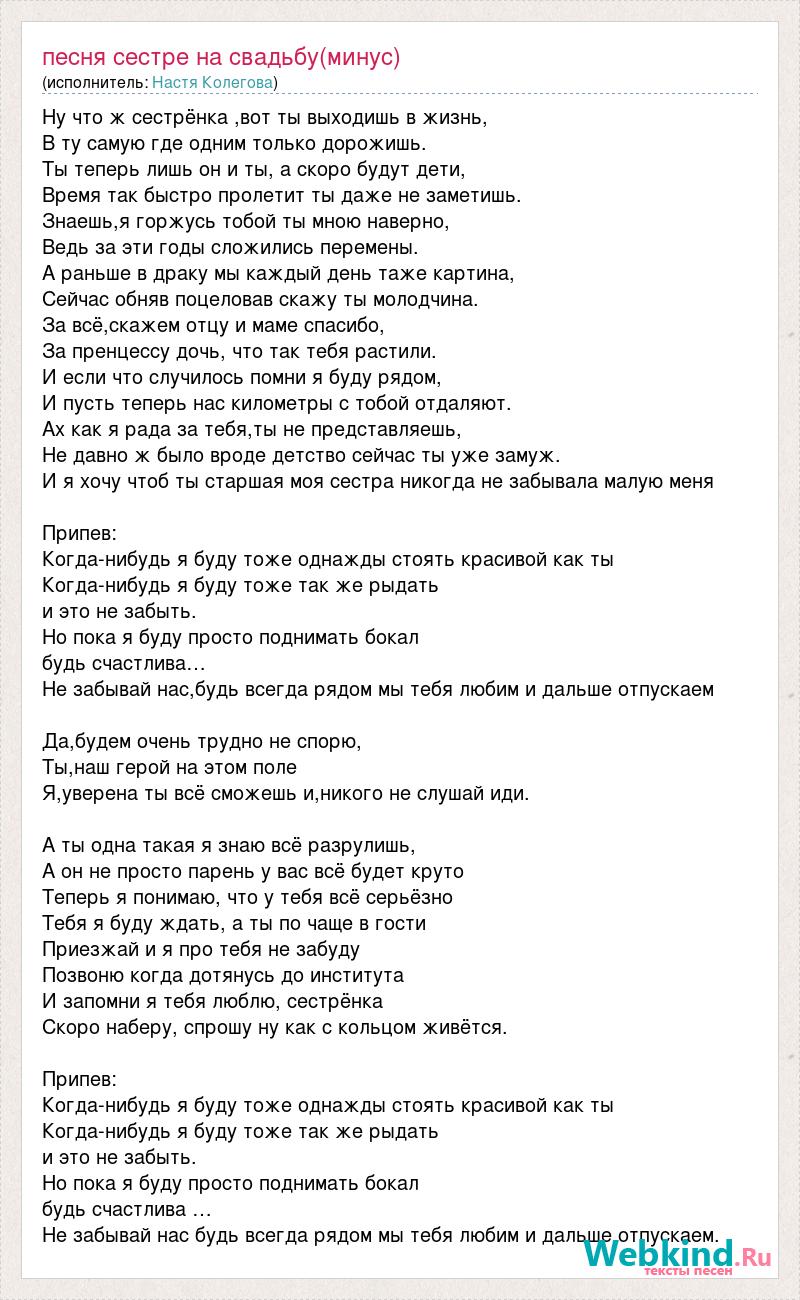 Ну что ж сестрёнка ,вот ты выходишь в жизнь, В ту самую где одним только дорожишь. Ты теперь лишь он и ты, а скоро будут дети, Время так быстро пролетит ты даже не заметишь. Знаешь,я горжусь тобой ты мною наверно, Ведь за эти годы сложились перемены. А раньше в драку мы каждый день таже картина, Сейчас обняв поцеловав скажу ты молодчина. За всё,скажем отцу и маме спасибо, За пренцессу дочь, что так тебя растили. И если что случилось помни я буду рядом, И пусть теперь нас километры с тобой отдаляют. Ах как я рада за тебя,ты не представляешь, Не давно ж было вроде детство сейчас ты уже замуж. И я хочу чтоб ты старшая моя сестра никогда не забывала малую меня Припев: Когда-нибудь я буду тоже однажды стоять красивой как ты Когда-нибудь я буду тоже так же рыдать и это не забыть. Но пока я буду просто поднимать бокал будь счастлива… Не забывай нас,будь всегда рядом мы тебя любим и дальше отпускаем Да,будем очень трудно не спорю, Ты,наш герой на этом поле Я,уверена ты всё сможешь и,никого не слушай иди. А ты одна такая я знаю всё разрулишь, А он не просто парень у вас всё будет круто Теперь я понимаю, что у тебя всё серьёзно Тебя я буду ждать, а ты по чаще в гости Приезжай и я про тебя не забуду Позвоню когда дотянусь до института И запомни я тебя люблю, сестрёнка Скоро наберу, спрошу ну как с кольцом живётся. Припев: Когда-нибудь я буду тоже однажды стоять красивой как ты Когда-нибудь я буду тоже так же рыдать и это не забыть. Но пока я буду просто поднимать бокал будь счастлива … Не забывай нас будь всегда рядом мы тебя любим и дальше отпускаем.