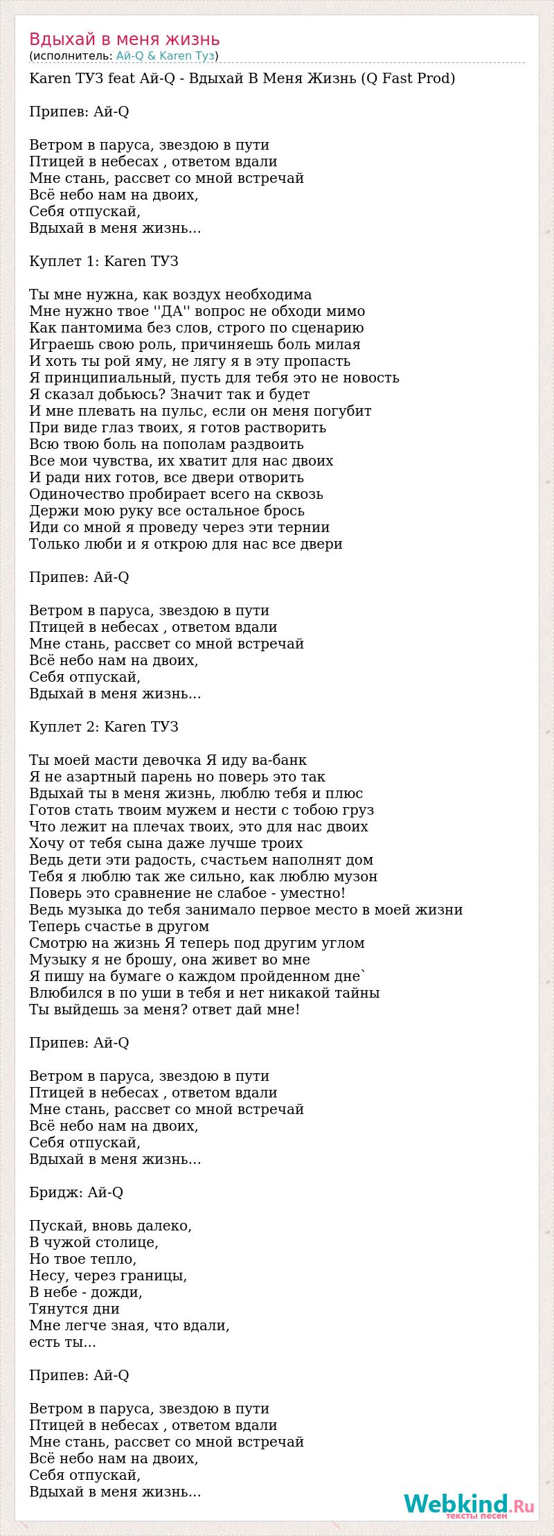 Karen ТУЗ feat Ай-Q - Вдыхай В Меня Жизнь (Q Fast Prod) Припев: Ай-Q Ветром в паруса, звездою в пути Птицей в небесах , ответом вдали Мне стань, рассвет со мной встречай Всё небо нам на двоих, Себя отпускай, Вдыхай в меня жизнь... Куплет 1: Karen ТУЗ Ты мне нужна, как воздух необходима Мне нужно твое ''ДА'' вопрос не обходи мимо Как пантомима без слов, строго по сценарию Играешь свою роль, причиняешь боль милая И хоть ты рой яму, не лягу я в эту пропасть Я принципиальный, пусть для тебя это не новость Я сказал добьюсь? Значит так и будет И мне плевать на пульс, если он меня погубит При виде глаз твоих, я готов растворить Всю твою боль на пополам раздвоить Все мои чувства, их хватит для нас двоих И ради них готов, все двери отворить Одиночество пробирает всего на сквозь Держи мою руку все остальное брось Иди со мной я проведу через эти тернии Только люби и я открою для нас все двери Припев: Ай-Q Ветром в паруса, звездою в пути Птицей в небесах , ответом вдали Мне стань, рассвет со мной встречай Всё небо нам на двоих, Себя отпускай, Вдыхай в меня жизнь... Куплет 2: Karen ТУЗ Ты моей масти девочка Я иду ва-банк Я не азартный парень но поверь это так Вдыхай ты в меня жизнь, люблю тебя и плюс Готов стать твоим мужем и нести с тобою груз Что лежит на плечах твоих, это для нас двоих Хочу от тебя сына даже лучше троих Ведь дети эти радость, счастьем наполнят дом Тебя я люблю так же сильно, как люблю музон Поверь это сравнение не слабое - уместно! Ведь музыка до тебя занимало первое место в моей жизни Теперь счастье в другом Смотрю на жизнь Я теперь под другим углом Музыку я не брошу, она живет во мне Я пишу на бумаге о каждом пройденном дне` Влюбился в по уши в тебя и нет никакой тайны Ты выйдешь за меня? ответ дай мне! Припев: Ай-Q Ветром в паруса, звездою в пути Птицей в небесах , ответом вдали Мне стань, рассвет со мной встречай Всё небо нам на двоих, Себя отпускай, Вдыхай в меня жизнь... Бридж: Ай-Q Пускай, вновь далеко, В чужой столице, Но твое тепло, Несу, через границы, В небе - дожди, Тянутся дни Мне легче зная, что вдали, есть ты... Припев: Ай-Q Ветром в паруса, звездою в пути Птицей в небесах , ответом вдали Мне стань, рассвет со мной встречай Всё небо нам на двоих, Себя отпускай, Вдыхай в меня жизнь...