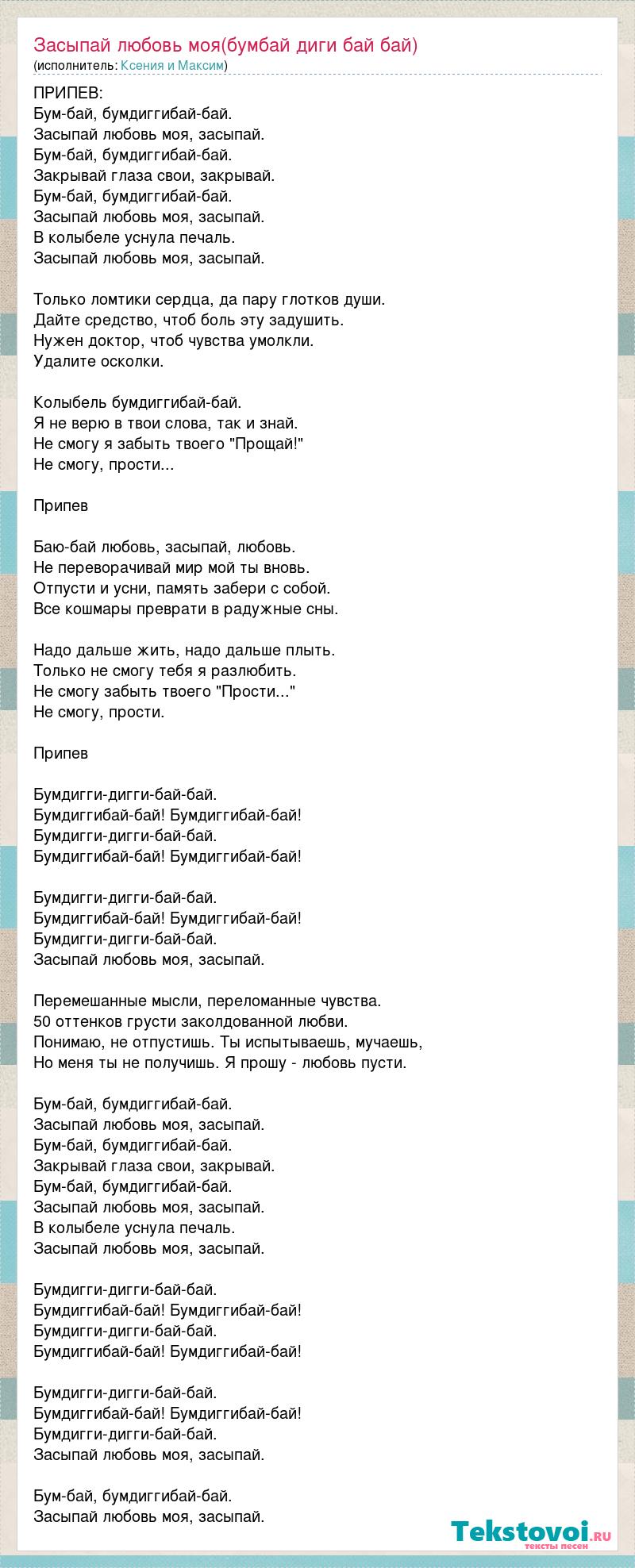 ПРИПЕВ: Бум-бай, бумдиггибай-бай. Засыпай любовь моя, засыпай. Бум-бай, бумдиггибай-бай. Закрывай глаза свои, закрывай. Бум-бай, бумдиггибай-бай. Засыпай любовь моя, засыпай. В колыбеле уснула печаль. Засыпай любовь моя, засыпай. Только ломтики сердца, да пару глотков души. Дайте средство, чтоб боль эту задушить. Нужен доктор, чтоб чувства умолкли. Удалите осколки. Колыбель бумдиггибай-бай. Я не верю в твои слова, так и знай. Не смогу я забыть твоего "Прощай!" Не смогу, прости... Припев Баю-бай любовь, засыпай, любовь. Не переворачивай мир мой ты вновь. Отпусти и усни, память забери с собой. Все кошмары преврати в радужные сны. Надо дальше жить, надо дальше плыть. Только не смогу тебя я разлюбить. Не смогу забыть твоего "Прости..." Не смогу, прости. Припев Бумдигги-дигги-бай-бай. Бумдиггибай-бай! Бумдиггибай-бай! Бумдигги-дигги-бай-бай. Бумдиггибай-бай! Бумдиггибай-бай! Бумдигги-дигги-бай-бай. Бумдиггибай-бай! Бумдиггибай-бай! Бумдигги-дигги-бай-бай. Засыпай любовь моя, засыпай. Перемешанные мысли, переломанные чувства. 50 оттенков грусти заколдованной любви. Понимаю, не отпустишь. Ты испытываешь, мучаешь, Но меня ты не получишь. Я прошу - любовь пусти. Бум-бай, бумдиггибай-бай. Засыпай любовь моя, засыпай. Бум-бай, бумдиггибай-бай. Закрывай глаза свои, закрывай. Бум-бай, бумдиггибай-бай. Засыпай любовь моя, засыпай. В колыбеле уснула печаль. Засыпай любовь моя, засыпай. Бумдигги-дигги-бай-бай. Бумдиггибай-бай! Бумдиггибай-бай! Бумдигги-дигги-бай-бай. Бумдиггибай-бай! Бумдиггибай-бай! Бумдигги-дигги-бай-бай. Бумдиггибай-бай! Бумдиггибай-бай! Бумдигги-дигги-бай-бай. Засыпай любовь моя, засыпай. Бум-бай, бумдиггибай-бай. Засыпай любовь моя, засыпай.