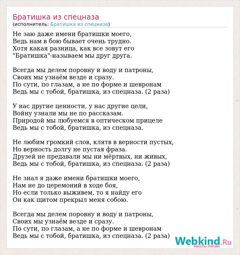 Не заю даже имени братишки моего, Ведь нам в бою бывает очень трудно. Хотя какая разница, как все зовут его "Братишка"-называем мы друг друга. Всегда мы делем поровну и воду и патроны, Своих мы узнаём везде и сразу. По сути, по глазам, а не по форме и шевронам Ведь мы с тобой, братишка, из спецназа. (2 раза) У нас другие ценности, у нас другие цели, Войну узнали мы не по рассказам. Природой мы любуемся в оптическом прицеле Ведь мы с тобой, братишка, из спецназа. Не любим громкий слов, клятв в верности пустых, Но верность долгу не пустая фраза. Друзей не предавали мы ни мёртвых, ни живых, Ведь мы с тобой, братишка, из спецназа. (2 раза) Не знал я даже имени братишки моего, Нам не до церемоний в ходе боя, Но если только выживем, то я найду его Он как щитом прекрыл меня собою. Всегда мы делем поровну и воду и патроны, Своих мы узнаём везде и сразу. По сути, по глазам, а не по форме и шевронам Ведь мы с тобой, братишка, из спецназа. (2 раза)