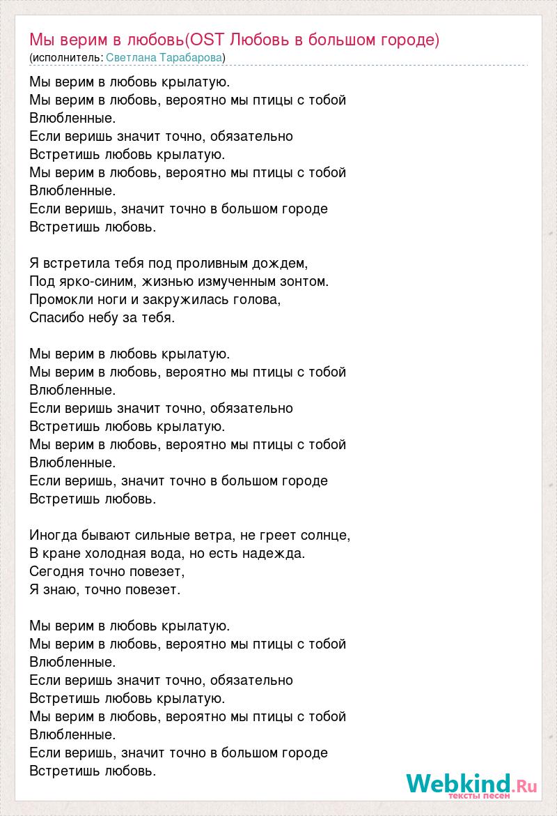 Мы верим в любовь крылатую. Мы верим в любовь, вероятно мы птицы с тобой Влюбленные. Если веришь значит точно, обязательно Встретишь любовь крылатую. Мы верим в любовь, вероятно мы птицы с тобой Влюбленные. Если веришь, значит точно в большом городе Встретишь любовь. Я встретила тебя под проливным дождем, Под ярко-синим, жизнью измученным зонтом. Промокли ноги и закружилась голова, Спасибо небу за тебя. Мы верим в любовь крылатую. Мы верим в любовь, вероятно мы птицы с тобой Влюбленные. Если веришь значит точно, обязательно Встретишь любовь крылатую. Мы верим в любовь, вероятно мы птицы с тобой Влюбленные. Если веришь, значит точно в большом городе Встретишь любовь. Иногда бывают сильные ветра, не греет солнце, В кране холодная вода, но есть надежда. Сегодня точно повезет, Я знаю, точно повезет. Мы верим в любовь крылатую. Мы верим в любовь, вероятно мы птицы с тобой Влюбленные. Если веришь значит точно, обязательно Встретишь любовь крылатую. Мы верим в любовь, вероятно мы птицы с тобой Влюбленные. Если веришь, значит точно в большом городе Встретишь любовь.