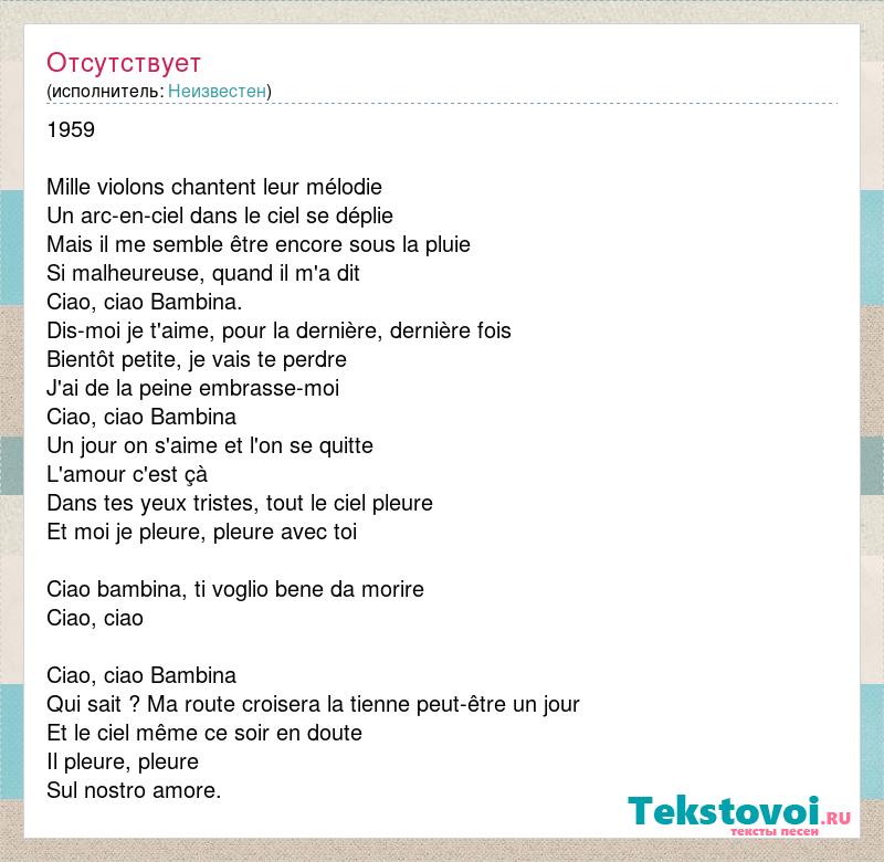 1959 Mille violons chantent leur mélodie Un arc-en-ciel dans le ciel se déplie Mais il me semble être encore sous la pluie Si malheureuse, quand il m'a dit Ciao, ciao Bambina. Dis-moi je t'aime, pour la dernière, dernière fois Bientôt petite, je vais te perdre J'ai de la peine embrasse-moi Ciao, ciao Bambina Un jour on s'aime et l'on se quitte L'amour c'est çà Dans tes yeux tristes, tout le ciel pleure Et moi je pleure, pleure avec toi Ciao bambina, ti voglio bene da morire Ciao, ciao Ciao, ciao Bambina Qui sait ? Ma route croisera la tienne peut-être un jour Et le ciel même ce soir en doute Il pleure, pleure Sul nostro amore.