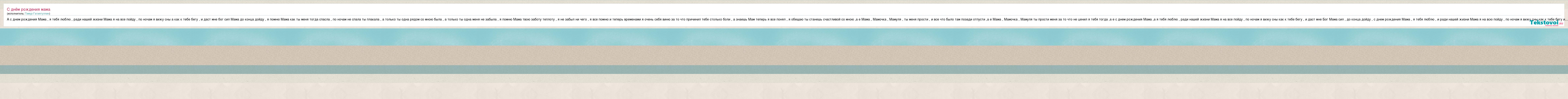 А с днем рождения Мама , я тебя люблю , ради нашей жизни Мама я на все пойду , по ночам я вижу сны а как к тебе бегу , и даст мне бог сил Мама до конца дойду , я помню Мама как ты меня тогда спасла , по ночам не спала ты плакала , а только ты одна рядом со мною была , а только ты одна меня не забыла , я помню Мама твою заботу теплоту , я не забыл ни чего , я все помню и теперь временами я очень себя виню за то что причинил тебе столько боли , а знаешь Мам теперь я все понял , я обещаю ты станешь счастливой со мною ,а е Мама , Мамочка , Мамуля , ты меня прости , и все что было там позади отпусти ,а е Мама , Мамочка , Мамуля ты прости меня за то что не ценил я тебя тогда ,а е с днем рождения Мама ,а я тебя люблю , ради нашей жизни Мама я на все пойду , по ночам я вижу сны как к тебе бегу , и даст мне Бог Мама сил , до конца дойду , с днем рождения Мама , я тебя люблю , и ради нашей жизни Мама я на всю пойду , по ночам я вижу сны как к тебе бегу и...