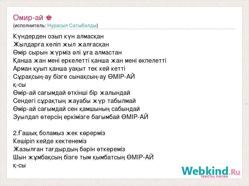 Күндерден озып күн алмасқан Жылдарға келіп жыл жалғасқан Өмір сырын жүрміз әлі ұға алмастан Қанша жан мені еркелетті қанша жан мені өкпелетті Арман қуып қанша уақыт тек кей кетті Сұрақсың-ау бізге сынақсың-ау ӨМІР-АЙ қ-сы Өмір-ай сағымдай өткінші бір жалындай Сендегі сұрақтың жауабы жүр табылмай Өмір-ай сағымдай сен қамшының сабындай Зуылдап өтерсің еркімізге бағымбай ӨМІР-АЙ 2.Ғашық боламыз жек көрерміз Кешіріп кейде кектенеміз Жазылған тағдырдың бәрін өткереміз Шын жұмбақсың бізге тым қымбатсың ӨМІР-АЙ қ-сы