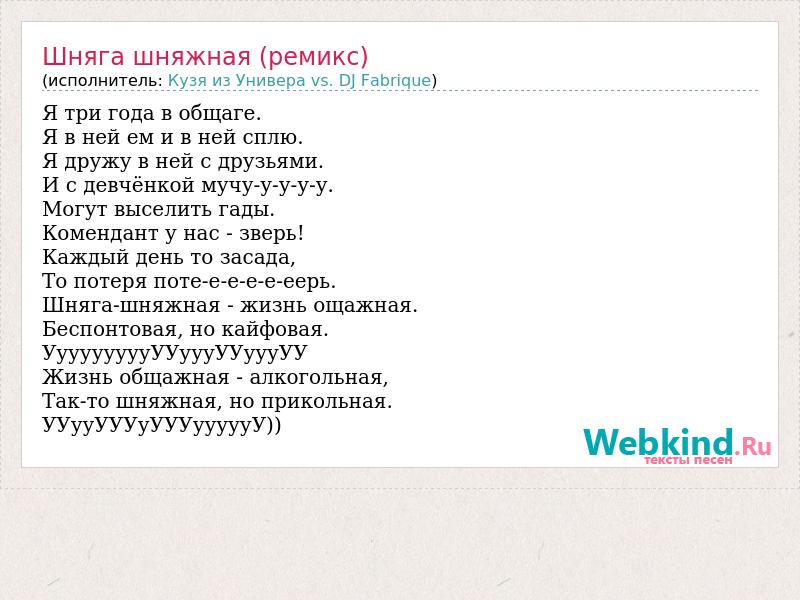 Я три года в общаге. Я в ней ем и в ней сплю. Я дружу в ней с друзьями. И с девчёнкой мучу-у-у-у-у. Могут выселить гады. Комендант у нас - зверь! Каждый день то засада, То потеря поте-е-е-е-е-еерь. Шняга-шняжная - жизнь ощажная. Беспонтовая, но кайфовая. УууууууууУУуууУУуууУУ Жизнь общажная - алкогольная, Так-то шняжная, но прикольная. УУууУУУуУУУуууууУ))