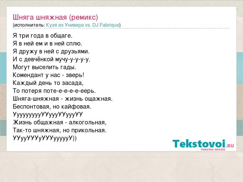Я три года в общаге. Я в ней ем и в ней сплю. Я дружу в ней с друзьями. И с девчёнкой мучу-у-у-у-у. Могут выселить гады. Комендант у нас - зверь! Каждый день то засада, То потеря поте-е-е-е-е-еерь. Шняга-шняжная - жизнь ощажная. Беспонтовая, но кайфовая. УууууууууУУуууУУуууУУ Жизнь общажная - алкогольная, Так-то шняжная, но прикольная. УУууУУУуУУУуууууУ))