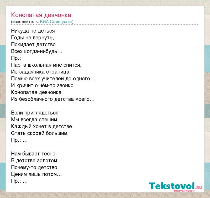 Никуда не деться – Годы не вернуть, Покидает детство Всех когда-нибудь… Пр.: Парта школьная мне снится, Из задачника страница, Помню всех учителей до одного… И кричит о чём-то звонко Конопатая девчонка Из безоблачного детства моего… Если приглядеться – Мы всегда спешим, Каждый хочет в детстве Стать скорей большим. Пр.: … Нам бывает тесно В детстве золотом, Почему-то детство Ценим лишь потом… Пр.: …