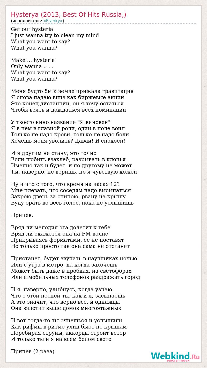 Get out hysteria I just wanna try to clean my mind What you want to say? What you wanna? Make ... hysteria Only wanna .. ... What you want to say? What you wanna? Меня будто бы к земле прижала гравитация Я снова падаю вниз как биржевые акции Это конец дистанции, он я хочу остаться Чтобы взять и дождаться всех номинаций У твоего кино название "Я виновен" Я в нем в главной роли, один в поле воин Только не надо крови, только не надо боли Хочешь меня уволить? Давай! Я спокоен! И я другим не стану, это точно Если любить взахлеб, разрывать в клочья Именно так и будет, и по другому не может Ты, наверно, не веришь, но я чувствую кожей Ну и что с того, что время на часах 12? Мне плевать, что соседям надо высыпаться Закрою дверь за спиною, рвану на крышу Буду орать во весь голос, пока не услышишь Припев. Вряд ли мелодия эта долетит к тебе Вряд ли окажется она на FM-волне Прикрываясь форматами, ее не поставят Но только просто так она сама не отстанет Пристанет, будет звучать в наушниках ночью Или с утра в метро, да когда захочешь Может быть даже в пробках, на светофорах Или с мобильных телефонов раздражать город И я, наверно, улыбнусь, когда узнаю Что с этой песней ты, как и я, засыпаешь А это значит, что верно все, и однажды Она взлетит выше домов многоэтажных И вот тогда-то ты очнешься и услышишь Как рифмы в ритме улиц бьют по крышам Перебирая струны, аккорды строит ветер И только ты и я на всем белом свете Припев (2 раза)