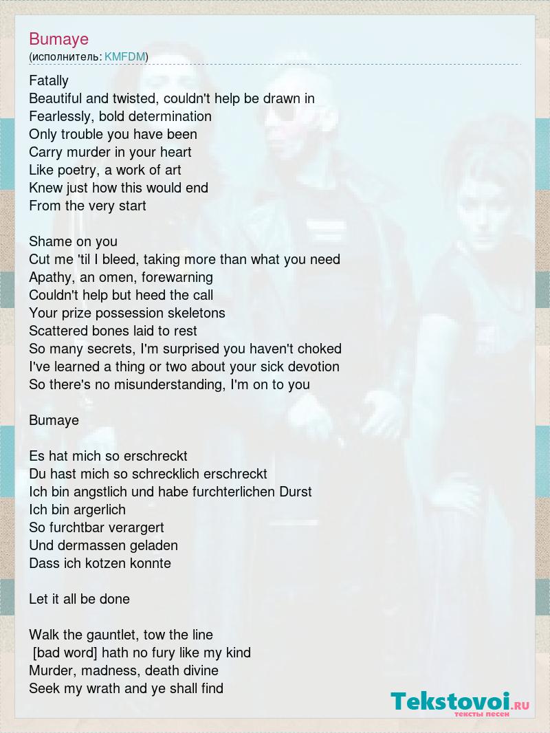 Fatally Beautiful and twisted, couldn't help be drawn in Fearlessly, bold determination Only trouble you have been Carry murder in your heart Like poetry, a work of art Knew just how this would end From the very start Shame on you Cut me 'til I bleed, taking more than what you need Apathy, an omen, forewarning Couldn't help but heed the call Your prize possession skeletons Scattered bones laid to rest So many secrets, I'm surprised you haven't choked I've learned a thing or two about your sick devotion So there's no misunderstanding, I'm on to you Bumaye Es hat mich so erschreckt Du hast mich so schrecklich erschreckt Ich bin angstlich und habe furchterlichen Durst Ich bin argerlich So furchtbar verargert Und dermassen geladen Dass ich kotzen konnte Let it all be done Walk the gauntlet, tow the line [bad word] hath no fury like my kind Murder, madness, death divine Seek my wrath and ye shall find