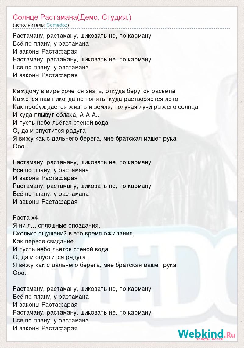 Растаману, растаману, шиковать не, по карману Всё по плану, у растамана И законы Растафарая Растаману, растаману, шиковать не, по карману Всё по плану, у растамана И законы Растафарая Каждому в мире хочется знать, откуда берутся расветы Кажется нам никогда не понять, куда растворяется лето Как пробуждается жизнь и земля, получая лучи рыжего солнца И куда плывут облака, А-А-А.. И пусть небо льётся стеной вода О, да и опустится радуга Я вижу как с дальнего берега, мне братская машет рука Ооо.. Растаману, растаману, шиковать не, по карману Всё по плану, у растамана И законы Растафарая Растаману, растаману, шиковать не, по карману Всё по плану, у растамана И законы Растафарая Раста х4 Я ни я.., сплошные опоздания. Сколько ощущений в это время ожидания, Как первое свидание. И пусть небо льётся стеной вода О, да и опустится радуга Я вижу как с дальнего берега, мне братская машет рука Ооо.. Растаману, растаману, шиковать не, по карману Всё по плану, у растамана И законы Растафарая Растаману, растаману, шиковать не, по карману Всё по плану, у растамана И законы Растафарая