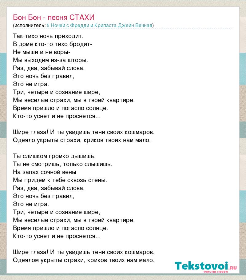 Так тихо ночь приходит. В доме кто-то тихо бродит- Не мыши и не воры- Мы выходим из-за шторы. Раз, два, забывай слова, Это ночь без правил, Это не игра. Три, четыре и сознание шире, Мы веселые страхи, мы в твоей квартире. Время пришло и погасло солнце. Кто-то уснет и не проснется... Шире глаза! И ты увидишь тени своих кошмаров. Одеяло укрыты страхи, криков твоих нам мало. Ты слишком громко дышишь, Ты не смотришь, только слышишь. На запах сочной вены Мы придем к тебе сквозь стены. Раз, два, забывай слова, Это ночь без правил, Это не игра. Три, четыре и сознание шире, Мы веселые страхи, мы в твоей квартире. Время пришло и погасло солнце. Кто-то уснет и не проснется... Шире глаза! И ты увидишь тени своих кошмаров. Одеялом укрыты страхи, криков твоих нам мало.