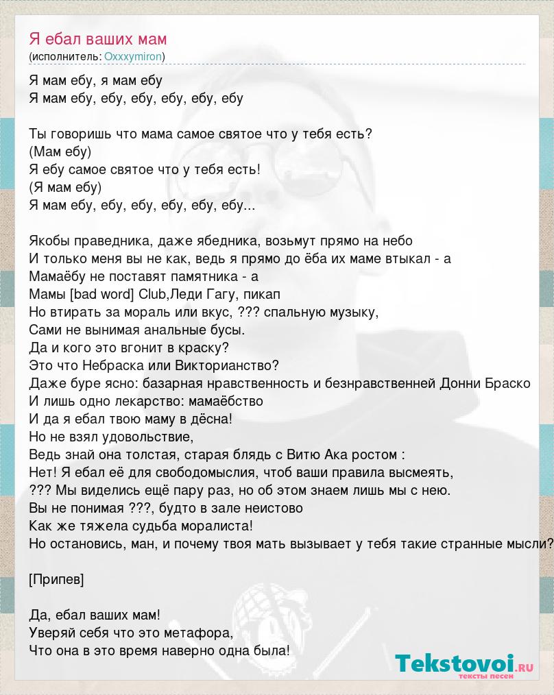 Я мам ебу, я мам ебу Я мам ебу, ебу, ебу, ебу, ебу, ебу Ты говоришь что мама самое святое что у тебя есть? (Мам ебу) Я ебу самое святое что у тебя есть! (Я мам ебу) Я мам ебу, ебу, ебу, ебу, ебу, ебу... Якобы праведника, даже ябедника, возьмут прямо на небо И только меня вы не как, ведь я прямо до ёба их маме втыкал - а Мамаёбу не поставят памятника - а Мамы [bad word] Club,Леди Гагу, пикап Но втирать за мораль или вкус, ??? спальную музыку, Сами не вынимая анальные бусы. Да и кого это вгонит в краску? Это что Небраска или Викторианство? Даже буре ясно: базарная нравственность и безнравственней Донни Браско И лишь одно лекарство: мамаёбство И да я ебал твою маму в дёсна! Но не взял удовольствие, Ведь знай она толстая, старая блядь с Витю Ака ростом : Нет! Я ебал её для свободомыслия, чтоб ваши правила высмеять, ??? Мы виделись ещё пару раз, но об этом знаем лишь мы с нею. Вы не понимая ???, будто в зале неистово Как же тяжела судьба моралиста! Но остановись, ман, и почему твоя мать вызывает у тебя такие странные мысли? [Припев] Да, ебал ваших мам! Уверяй себя что это метафора, Что она в это время наверно одна была!