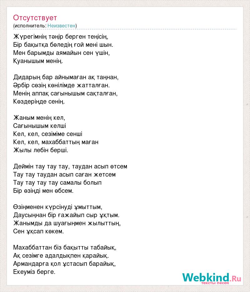 Жүрегімнің тәңір берген теңісің, Бір бақытқа бөледің ғой мені шын. Мен барымды аямайын сен үшін, Қуанышым менің. Дидарың бар айнымаған ақ таңнан, Әрбір сөзің көнілімде жатталған. Менің аппақ сағынышым сақталған, Көздеріңде сенің. Жаным менің кел, Сағынышым келші Кел, кел, сезіміме сенші Кел, кел, махаббаттың маған Жылы лебін берші. Деймін тау тау тау, таудан асып өтсем Тау тау таудан асып саған жетсем Тау тау тау тау самалы болып Бір өзіңді мен өбсем. Өзіңменен күрсінуді ұмыттым, Даусыңнан бір ғажайып сыр ұқтым. Жанымды да шуағыңмен жылыттың, Сен ұқсап көкем. Махаббаттан біз бақытты табайық, Ақ сезімге адалдықпен қарайық. Армандарға қол ұстасып барайық, Екеуміз берге.