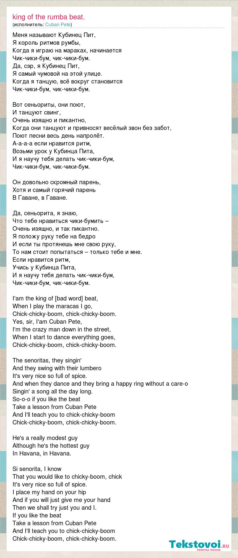 Меня называют Кубинец Пит, Я король ритмов румбы, Когда я играю на мараках, начинается Чик-чики-бум, чик-чики-бум. Да, сэр, я Кубинец Пит, Я самый чумовой на этой улице. Когда я танцую, всё вокруг становится Чик-чики-бум, чик-чики-бум. Вот сеньориты, они поют, И танцуют свинг, Очень изящно и пикантно, Когда они танцуют и привносят весёлый звон без забот, Поют песни весь день напролёт. А-а-а-а если нравится ритм, Возьми урок у Кубинца Пита, И я научу тебя делать чик-чики-бум, Чик-чики-бум, чик-чики-бум. Он довольно скромный парень, Хотя и самый горячий парень В Гаване, в Гаване. Да, сеньорита, я знаю, Что тебе нравиться чики-бумить – Очень изящно, и так пикантно. Я положу руку тебе на бедро И если ты протянешь мне свою руку, То нам стоит попытаться – только тебе и мне. Если нравится ритм, Учись у Кубинца Пита, И я научу тебя делать чик-чики-бум, Чик-чики-бум, чик-чики-бум. I'am the king of the rumba beat, When I play the maracas I go, Chick-chicky-boom, chick-chicky-boom. Yes, sir, I'am Cuban Pete, I'm the crazy man down in the street, When I start to dance everything goes, Chick-chicky-boom, chick-chicky-boom. The senoritas, they singin' And they swing with their lumbero It's very nice so full of spice. And when they dance and they bring a happy ring without a care-o Singin' a song all the day long. So-o-o if you like the beat Take a lesson from Cuban Pete And I'll teach you to chick-chicky-boom Chick-chicky-boom, chick-chicky-boom. He's a really modest guy Although he's the hottest guy In Havana, in Havana. Si senorita, I know That you would like to chicky-boom, chick It's very nice so full of spice. I place my hand on your hip And if you will just give me your hand Then we shall try just you and I. If you like the beat Take a lesson from Cuban Pete And I'll teach you to chick-chicky-boom Chick-chicky-boom, chick-chicky-boom.