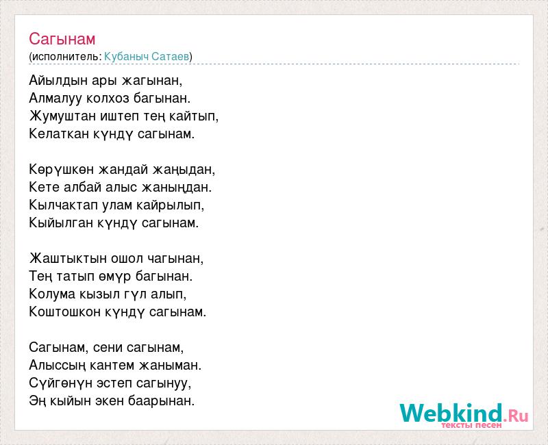 Айылдын ары жагынан, Алмалуу колхоз багынан. Жумуштан иштеп тең кайтып, Келаткан күндү сагынам. Көрүшкөн жандай жаңыдан, Кете албай алыс жаныңдан. Кылчактап улам кайрылып, Кыйылган күндү сагынам. Жаштыктын ошол чагынан, Тең татып өмүр багынан. Колума кызыл гүл алып, Коштошкон күндү сагынам. Сагынам, сени сагынам, Алыссың кантем жаныман. Сүйгөнүн эстеп сагынуу, Эң кыйын экен баарынан.