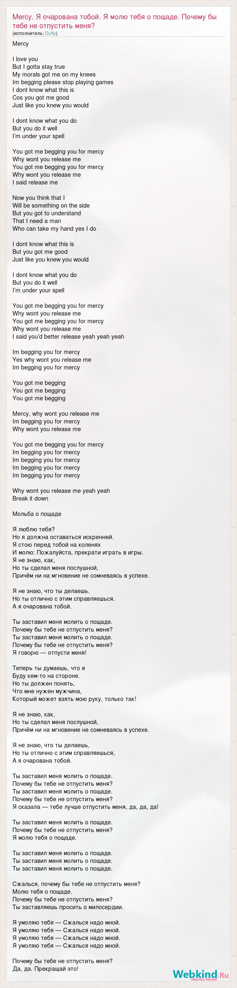 Mercy I love you But I gotta stay true My morals got me on my knees Im begging please stop playing games I dont know what this is Cos you got me good Just like you knew you would I dont know what you do But you do it well I’m under your spell You got me begging you for mercy Why wont you release me You got me begging you for mercy Why wont you release me I said release me Now you think that I Will be something on the side But you got to understand That I need a man Who can take my hand yes I do I dont know what this is But you got me good Just like you knew you would I dont know what you do But you do it well I’m under your spell You got me begging you for mercy Why wont you release me You got me begging you for mercy Why wont you release me I said you’d better release yeah yeah yeah Im begging you for mercy Yes why wont you release me Im begging you for mercy You got me begging You got me begging You got me begging Mercy, why wont you release me Im begging you for mercy Why wont you release me You got me begging you for mercy Im begging you for mercy Im begging you for mercy Im begging you for mercy Im begging you for mercy Why wont you release me yeah yeah Break it down Мольба о пощаде Я люблю тебя? Но я должна оставаться искренней. Я стою перед тобой на коленях И молю: Пожалуйста, прекрати играть в игры. Я не знаю, как, Но ты сделал меня послушной, Причём ни на мгновение не сомневаясь в успехе. Я не знаю, что ты делаешь. Но ты отлично с этим справляешься. А я очарована тобой. Ты заставил меня молить о пощаде. Почему бы тебе не отпустить меня? Ты заставил меня молить о пощаде. Почему бы тебе не отпустить меня? Я говорю — отпусти меня! Теперь ты думаешь, что я Буду кем-то на стороне. Но ты должен понять, Что мне нужен мужчина, Который может взять мою руку, только так! Я не знаю, как, Но ты сделал меня послушной, Причём ни на мгновение не сомневаясь в успехе. Я не знаю, что ты делаешь, Но ты отлично с этим справляешься, А я очарована тобой. Ты заставил меня молить о пощаде. Почему бы тебе не отпустить меня? Ты заставил меня молить о пощаде. Почему бы тебе не отпустить меня? Я сказала — тебе лучше отпустить меня, да, да, да! Ты заставил меня молить о пощаде. Почему бы тебе не отпустить меня? Я молю тебя о пощаде. Ты заставил меня молить о пощаде. Ты заставил меня молить о пощаде. Ты заставил меня молить о пощаде. Сжалься, почему бы тебе не отпустить меня? Молю тебя о пощаде. Почему бы тебе не отпустить меня? Ты заставляешь просить о милосердии. Я умоляю тебя — Сжалься надо мной. Я умоляю тебя — Сжалься надо мной. Я умоляю тебя — Сжалься надо мной. Я умоляю тебя — Сжалься надо мной. Почему бы тебе не отпустить меня? Да, да. Прекращай это!