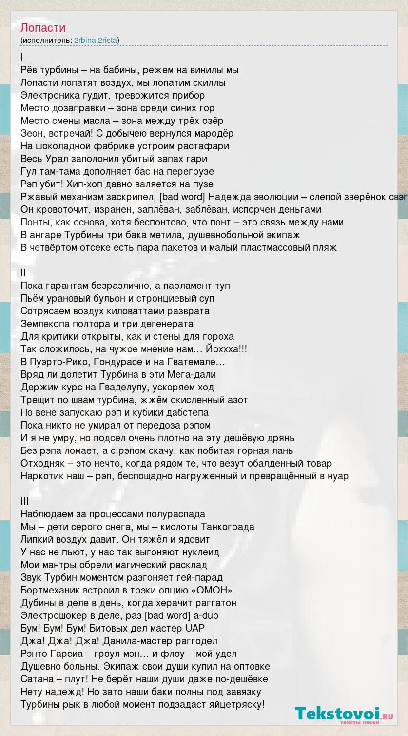 I Рёв турбины – на бабины, режем на винилы мы Лопасти лопатят воздух, мы лопатим скиллы Электроника гудит, тревожится прибор Место дозаправки – зона среди синих гор Место смены масла – зона между трёх озёр Зеон, встречай! С добычею вернулся мародёр На шоколадной фабрике устроим растафари Весь Урал заполонил убитый запах гари Гул там-тама дополняет бас на перегрузе Рэп убит! Хип-хоп давно валяется на пузе Ржавый механизм заскрипел, грядёт comeback Надежда эволюции – слепой зверёнок свэг Он кровоточит, изранен, заплёван, заблёван, испорчен деньгами Понты, как основа, хотя беспонтово, что понт – это связь между нами В ангаре Турбины три бака метила, душевнобольной экипаж В четвёртом отсеке есть пара пакетов и малый пластмассовый пляж II Пока гарантам безразлично, а парламент туп Пьём урановый бульон и стронциевый суп Сотрясаем воздух киловаттами разврата Землекопа полтора и три дегенерата Для критики открыты, как и стены для гороха Так сложилось, на чужое мнение нам… Йоххха!!! В Пуэрто-Рико, Гондурасе и на Гватемале… Вряд ли долетит Турбина в эти Мега-дали Держим курс на Гваделупу, ускоряем ход Трещит по швам турбина, жжём окисленный азот По вене запускаю рэп и кубики дабстепа Пока никто не умирал от передоза рэпом И я не умру, но подсел очень плотно на эту дешёвую дрянь Без рэпа ломает, а с рэпом скачу, как побитая горная лань Отходняк – это нечто, когда рядом те, что везут обалденный товар Наркотик наш – рэп, беспощадно нагруженный и превращённый в нуар III Наблюдаем за процессами полураспада Мы – дети серого снега, мы – кислоты Танкограда Липкий воздух давит. Он тяжёл и ядовит У нас не пьют, у нас так выгоняют нуклеид Мои мантры обрели магический расклад Звук Турбин моментом разгоняет гей-парад Бортмеханик встроил в трэки опцию «ОМОН» Дубины в деле в день, когда херачит раггатон Электрошокер в деле, раз херачит rub-a-dub Бум! Бум! Бум! Битовых дел мастер UAP Джа! Джа! Джа! Данила-мастер раггодел Рэнто Гарсиа – гроул-мэн… и флоу – мой удел Душевно больны. Экипаж свои души купил на оптовке Сатана – плут! Не берёт наши души даже по-дешёвке Нету надежд! Но зато наши баки полны под завязку Турбины рык в любой момент подзадаст яйцетряску!