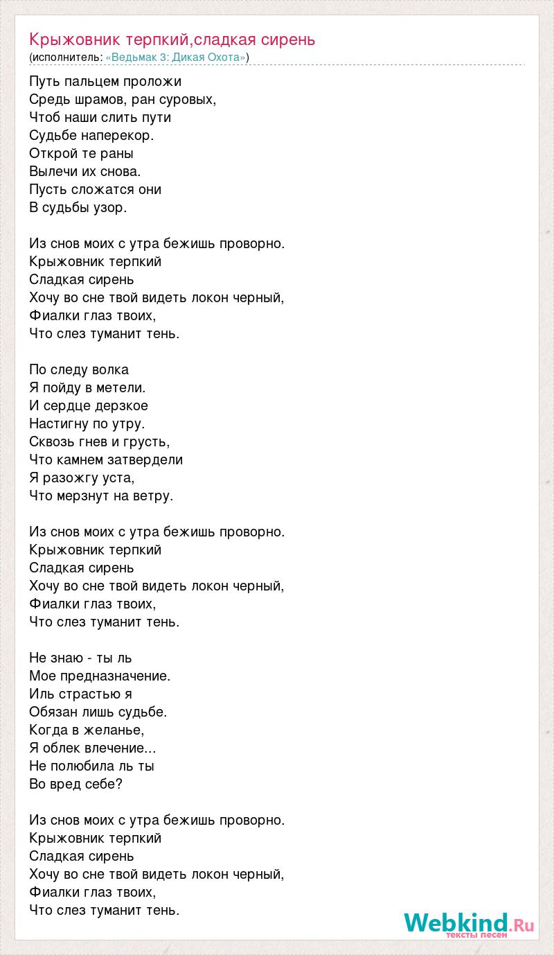 Путь пальцем проложи Средь шрамов, ран суровых, Чтоб наши слить пути Судьбе наперекор. Открой те раны Вылечи их снова. Пусть сложатся они В судьбы узор. Из снов моих с утра бежишь проворно. Крыжовник терпкий Сладкая сирень Хочу во сне твой видеть локон черный, Фиалки глаз твоих, Что слез туманит тень. По следу волка Я пойду в метели. И сердце дерзкое Настигну по утру. Сквозь гнев и грусть, Что камнем затвердели Я разожгу уста, Что мерзнут на ветру. Из снов моих с утра бежишь проворно. Крыжовник терпкий Сладкая сирень Хочу во сне твой видеть локон черный, Фиалки глаз твоих, Что слез туманит тень. Не знаю - ты ль Мое предназначение. Иль страстью я Обязан лишь судьбе. Когда в желанье, Я облек влечение... Не полюбила ль ты Во вред себе? Из снов моих с утра бежишь проворно. Крыжовник терпкий Сладкая сирень Хочу во сне твой видеть локон черный, Фиалки глаз твоих, Что слез туманит тень.