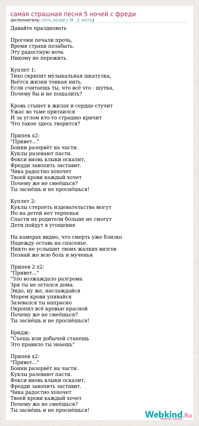 Давайте праздновать Прогони печали прочь, Время страхи позабыть. Эту радостную ночь Никому не пережить. Куплет 1: Тихо скрипит музыкальная шкатулка, Вьётся жизни тонкая нить. Если считаешь ты, что всё это - шутка, Почему бы и не пошалить? Кровь стынет в жилах и сердце стучит Ужас во тьме притаился И за углом кто-то страшно кричит Что такое здесь творится? Припев x2: "Привет..." Бонни разорвёт на части. Куклы разевают пасти. Фокси вновь клыки оскалит, Фредди завопить заставит. Чика радостно хохочет Твоей крови каждый хочет Почему же не смеёшься? Ты заснёшь и не проснёшься! Куплет 2: Куклы стерпеть издевательства могут Но на детей нет терпенья Спасти их родители больше не смогут Дети пойдут в угощения На камерах видно, что смерть уже близко Надежду оставь на спасенье. Никто не услышит твоих жалких визгов Познай же всю боль и мученья Припев 2 x2: "Привет..." "Зло возжаждало разгрома Зря ты не остался дома. Эндо, ну же, наслаждайся Морем крови упивайся Зазевался ты напрасно Окропил всё кровью красной Почему же не смеёшься? Ты заснёшь и не проснёшься! Бридж: "Съешь или добычей станешь Это правило ты знаешь" Припев x2: "Привет..." Бонни разорвёт на части. Куклы разевают пасти. Фокси вновь клыки оскалит, Фредди завопить заставит. Чика радостно хохочет Твоей крови каждый хочет Почему же не смеёшься? Ты заснёшь и не проснёшься!