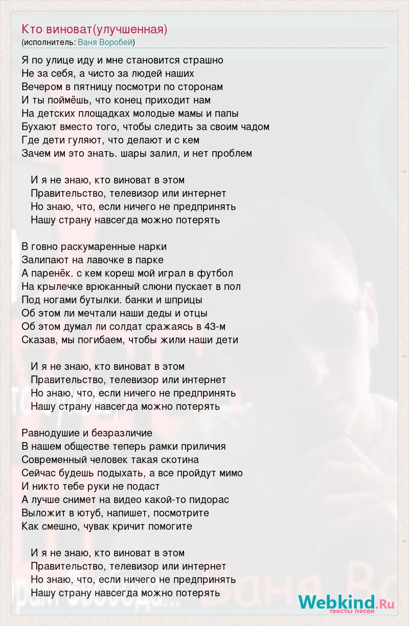Я по улице иду и мне становится страшно Не за себя, а чисто за людей наших Вечером в пятницу посмотри по сторонам И ты поймёшь, что конец приходит нам На детских площадках молодые мамы и папы Бухают вместо того, чтобы следить за своим чадом Где дети гуляют, что делают и с кем Зачем им это знать. шары залил, и нет проблем И я не знаю, кто виноват в этом Правительство, телевизор или интернет Но знаю, что, если ничего не предпринять Нашу страну навсегда можно потерять В говно раскумаренные нарки Залипают на лавочке в парке А паренёк. с кем кореш мой играл в футбол На крылечке врюканный слюни пускает в пол Под ногами бутылки. банки и шприцы Об этом ли мечтали наши деды и отцы Об этом думал ли солдат сражаясь в 43-м Сказав, мы погибаем, чтобы жили наши дети И я не знаю, кто виноват в этом Правительство, телевизор или интернет Но знаю, что, если ничего не предпринять Нашу страну навсегда можно потерять Равнодушие и безразличие В нашем обществе теперь рамки приличия Современный человек такая скотина Сейчас будешь подыхать, а все пройдут мимо И никто тебе руки не подаст А лучше снимет на видео какой-то пидорас Выложит в ютуб, напишет, посмотрите Как смешно, чувак кричит помогите И я не знаю, кто виноват в этом Правительство, телевизор или интернет Но знаю, что, если ничего не предпринять Нашу страну навсегда можно потерять