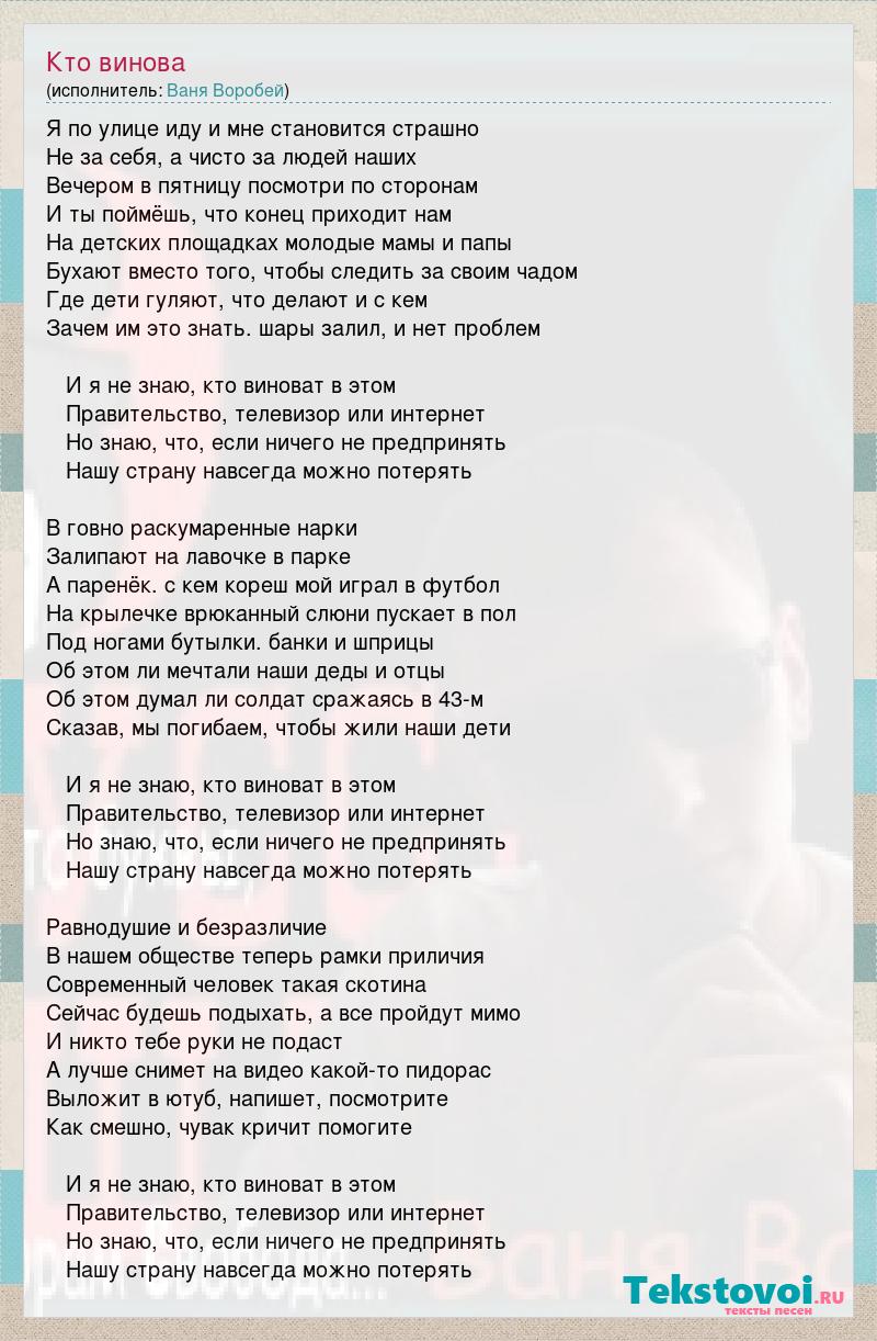 Я по улице иду и мне становится страшно Не за себя, а чисто за людей наших Вечером в пятницу посмотри по сторонам И ты поймёшь, что конец приходит нам На детских площадках молодые мамы и папы Бухают вместо того, чтобы следить за своим чадом Где дети гуляют, что делают и с кем Зачем им это знать. шары залил, и нет проблем И я не знаю, кто виноват в этом Правительство, телевизор или интернет Но знаю, что, если ничего не предпринять Нашу страну навсегда можно потерять В говно раскумаренные нарки Залипают на лавочке в парке А паренёк. с кем кореш мой играл в футбол На крылечке врюканный слюни пускает в пол Под ногами бутылки. банки и шприцы Об этом ли мечтали наши деды и отцы Об этом думал ли солдат сражаясь в 43-м Сказав, мы погибаем, чтобы жили наши дети И я не знаю, кто виноват в этом Правительство, телевизор или интернет Но знаю, что, если ничего не предпринять Нашу страну навсегда можно потерять Равнодушие и безразличие В нашем обществе теперь рамки приличия Современный человек такая скотина Сейчас будешь подыхать, а все пройдут мимо И никто тебе руки не подаст А лучше снимет на видео какой-то пидорас Выложит в ютуб, напишет, посмотрите Как смешно, чувак кричит помогите И я не знаю, кто виноват в этом Правительство, телевизор или интернет Но знаю, что, если ничего не предпринять Нашу страну навсегда можно потерять