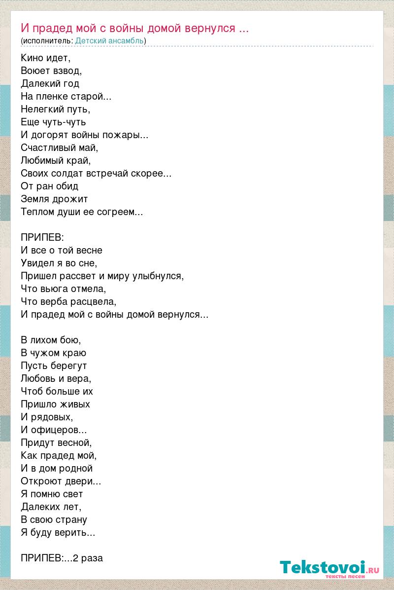 Кино идет, Воюет взвод, Далекий год На пленке старой... Нелегкий путь, Еще чуть-чуть И догорят войны пожары... Счастливый май, Любимый край, Своих солдат встречай скорее... От ран обид Земля дрожит Теплом души ее согреем... ПРИПЕВ: И все о той весне Увидел я во сне, Пришел рассвет и миру улыбнулся, Что вьюга отмела, Что верба расцвела, И прадед мой с войны домой вернулся... В лихом бою, В чужом краю Пусть берегут Любовь и вера, Чтоб больше их Пришло живых И рядовых, И офицеров... Придут весной, Как прадед мой, И в дом родной Откроют двери... Я помню свет Далеких лет, В свою страну Я буду верить... ПРИПЕВ:...2 раза