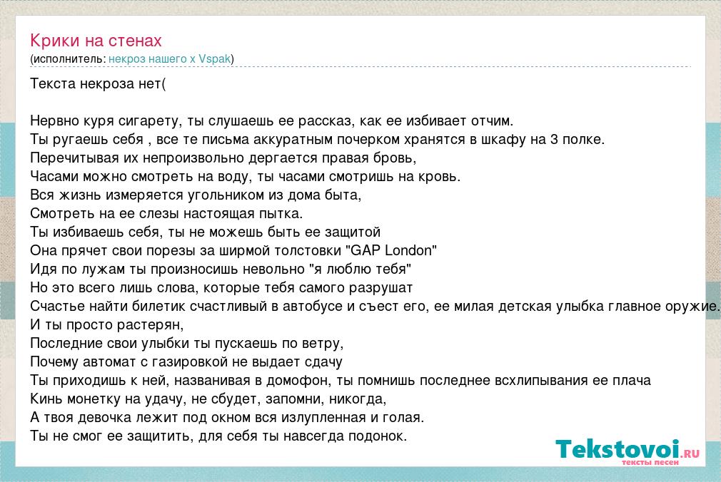 Текста некроза нет( Нервно куря сигарету, ты слушаешь ее рассказ, как ее избивает отчим. Ты ругаешь себя , все те письма аккуратным почерком хранятся в шкафу на 3 полке. Перечитывая их непроизвольно дергается правая бровь, Часами можно смотреть на воду, ты часами смотришь на кровь. Вся жизнь измеряется угольником из дома быта, Смотреть на ее слезы настоящая пытка. Ты избиваешь себя, ты не можешь быть ее защитой Она прячет свои порезы за ширмой толстовки "GAP London" Идя по лужам ты произносишь невольно "я люблю тебя" Но это всего лишь слова, которые тебя самого разрушат Счастье найти билетик счастливый в автобусе и съест его, ее милая детская улыбка главное оружие. И ты просто растерян, Последние свои улыбки ты пускаешь по ветру, Почему автомат с газировкой не выдает сдачу Ты приходишь к ней, названивая в домофон, ты помнишь последнее всхлипывания ее плача Кинь монетку на удачу, не сбудет, запомни, никогда, А твоя девочка лежит под окном вся излупленная и голая. Ты не смог ее защитить, для себя ты навсегда подонок.