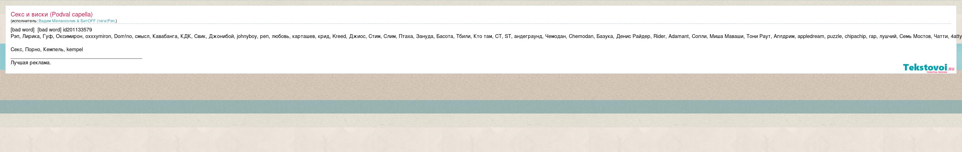 [bad word] [bad word] id201133579 Рэп, Лирика, Гуф, Оксимирон, oxxxymiron, Dom!no, смысл, Кавабанга, КДК, Свик, Джонибой, johnyboy, реп, любовь, карташев, крид, Kreed, Джиос, Стим, Слим, Птаха, Зануда, Басота, Тбили, Кто там, СТ, ST, андеграунд, Чемодан, Chemodan, Базука, Денис Райдер, Rider, Adamant, Сопли, Миша Маваши, Тони Раут, Аплдрим, appledream, puzzle, chipachip, rap, лушчий, Семь Мостов, Чатти, 4atty Секс, Порно, Кемпель, kempel _______________________________________________ Лучшая реклама.
