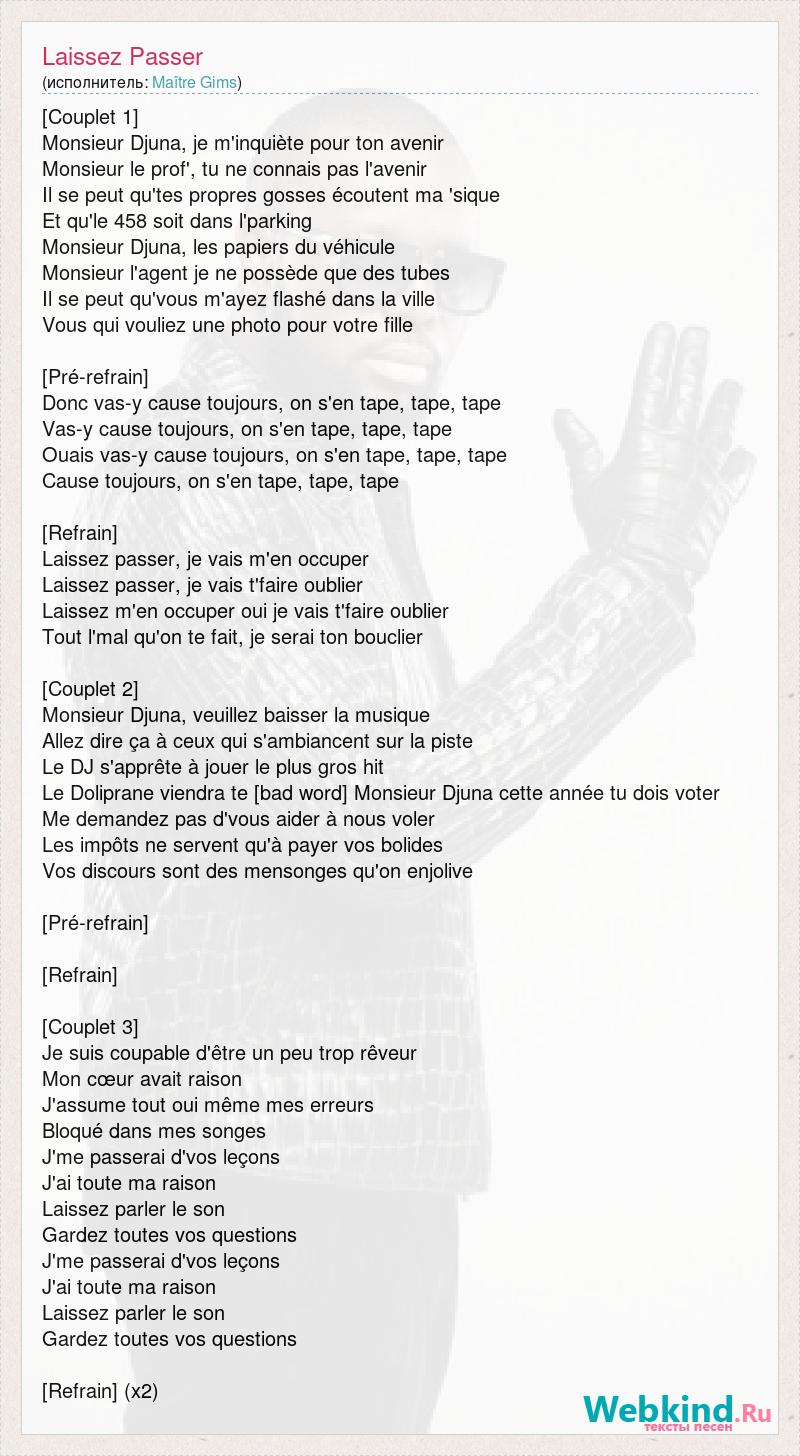 [Couplet 1] Monsieur Djuna, je m'inquiète pour ton avenir Monsieur le prof', tu ne connais pas l'avenir Il se peut qu'tes propres gosses écoutent ma 'sique Et qu'le 458 soit dans l'parking Monsieur Djuna, les papiers du véhicule Monsieur l'agent je ne possède que des tubes Il se peut qu'vous m'ayez flashé dans la ville Vous qui vouliez une photo pour votre fille [Pré-refrain] Donc vas-y cause toujours, on s'en tape, tape, tape Vas-y cause toujours, on s'en tape, tape, tape Ouais vas-y cause toujours, on s'en tape, tape, tape Cause toujours, on s'en tape, tape, tape [Refrain] Laissez passer, je vais m'en occuper Laissez passer, je vais t'faire oublier Laissez m'en occuper oui je vais t'faire oublier Tout l'mal qu'on te fait, je serai ton bouclier [Couplet 2] Monsieur Djuna, veuillez baisser la musique Allez dire ça à ceux qui s'ambiancent sur la piste Le DJ s'apprête à jouer le plus gros hit Le Doliprane viendra te [bad word] Monsieur Djuna cette année tu dois voter Me demandez pas d'vous aider à nous voler Les impôts ne servent qu'à payer vos bolides Vos discours sont des mensonges qu'on enjolive [Pré-refrain] [Refrain] [Couplet 3] Je suis coupable d'être un peu trop rêveur Mon cœur avait raison J'assume tout oui même mes erreurs Bloqué dans mes songes J'me passerai d'vos leçons J'ai toute ma raison Laissez parler le son Gardez toutes vos questions J'me passerai d'vos leçons J'ai toute ma raison Laissez parler le son Gardez toutes vos questions [Refrain] (x2)