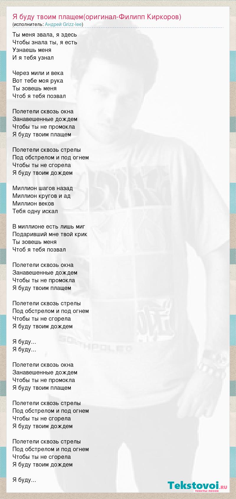 Ты меня звала, я здесь Чтобы знала ты, я есть Узнаешь меня И я тебя узнал Через мили и века Вот тебе моя рука Ты зовешь меня Чтоб я тебя позвал Полетели сквозь окна Занавешенные дождем Чтобы ты не промокла Я буду твоим плащем Полетели сквозь стрелы Под обстрелом и под огнем Чтобы ты не сгорела Я буду твоим дождем Миллион шагов назад Миллион кругов и ад Миллион веков Тебя одну искал В миллионе есть лишь миг Подаривший мне твой крик Ты зовешь меня Чтоб я тебя позвал Полетели сквозь окна Занавешенные дождем Чтобы ты не промокла Я буду твоим плащем Полетели сквозь стрелы Под обстрелом и под огнем Чтобы ты не сгорела Я буду твоим дождем Я буду... Я буду... Полетели сквозь окна Занавешенные дождем Чтобы ты не промокла Я буду твоим плащем Полетели сквозь стрелы Под обстрелом и под огнем Чтобы ты не сгорела Я буду твоим дождем Полетели сквозь стрелы Под обстрелом и под огнем Чтобы ты не сгорела Я буду твоим дождем Я буду...