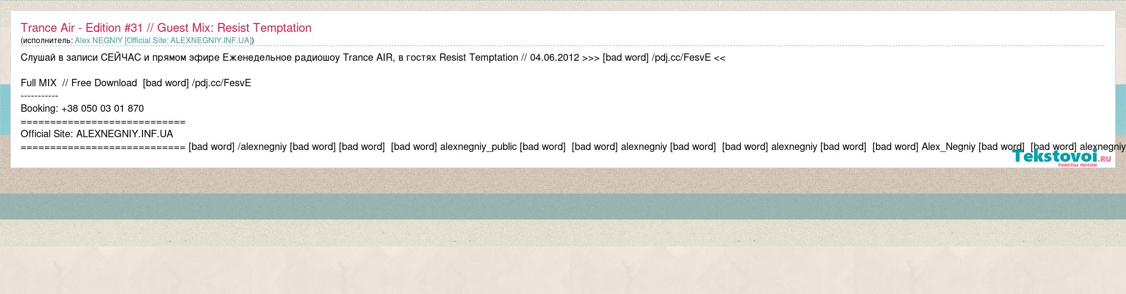 Главная→Исполнители→Alex NEGNIY [Official Site: ALEXNEGNIY.INF.UA]→Trance Air - Edition #31 // Guest Mix: Resist Temptation