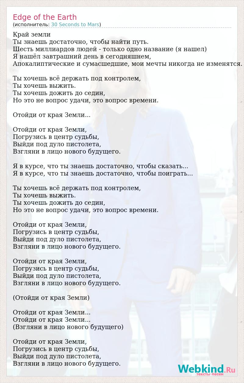 Край земли Ты знаешь достаточно, чтобы найти путь. Шесть миллиардов людей - только одно название (я нашел) Я нашёл завтрашний день в сегодняшнем, Апокалиптические и сумасшедшие, мои мечты никогда не изменятся. Ты хочешь всё держать под контролем, Ты хочешь выжить. Ты хочешь дожить до седин, Но это не вопрос удачи, это вопрос времени. Отойди от края Земли... Отойди от края Земли, Погрузись в центр судьбы, Выйди под дуло пистолета, Взгляни в лицо нового будущего. Я в курсе, что ты знаешь достаточно, чтобы сказать... Я в курсе, что ты знаешь достаточно, чтобы поиграть... Ты хочешь всё держать под контролем, Ты хочешь выжить. Ты хочешь дожить до седин, Но это не вопрос удачи, это вопрос времени. Отойди от края Земли, Погрузись в центр судьбы, Выйди под дуло пистолета, Взгляни в лицо нового будущего. Отойди от края Земли, Погрузись в центр судьбы, Выйди под дуло пистолета, Взгляни в лицо нового будущего. (Отойди от края Земли) Отойди от края Земли... Отойди от края Земли... (Взгляни в лицо нового будущего) Отойди от края Земли, Погрузись в центр судьбы, Выйди под дуло пистолета, Взгляни в лицо нового будущего.