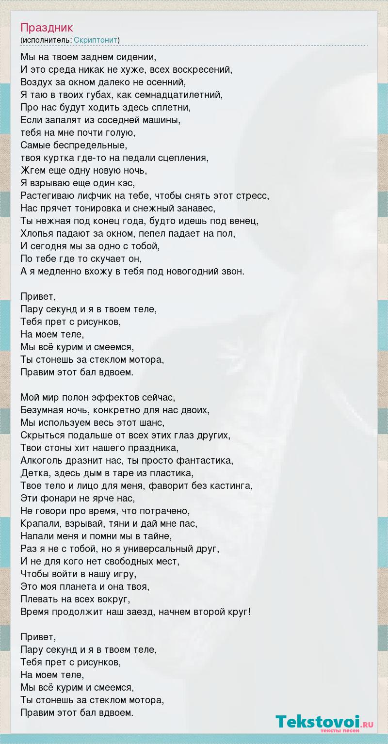 Мы на твоем заднем сидении, И это среда никак не хуже, всех воскресений, Воздух за окном далеко не осенний, Я таю в твоих губах, как семнадцатилетний, Про нас будут ходить здесь сплетни, Если запалят из соседней машины, тебя на мне почти голую, Самые беспредельные, твоя куртка где-то на педали сцепления, Жгем еще одну новую ночь, Я взрываю еще один кэс, Растегиваю лифчик на тебе, чтобы снять этот стресс, Нас прячет тонировка и снежный занавес, Ты нежная под конец года, будто идешь под венец, Хлопья падают за окном, пепел падает на пол, И сегодня мы за одно с тобой, По тебе где то скучает он, А я медленно вхожу в тебя под новогодний звон. Привет, Пару секунд и я в твоем теле, Тебя прет с рисунков, На моем теле, Мы всё курим и смеемся, Ты стонешь за стеклом мотора, Правим этот бал вдвоем. Мой мир полон эффектов сейчас, Безумная ночь, конкретно для нас двоих, Мы используем весь этот шанс, Скрыться подальше от всех этих глаз других, Твои стоны хит нашего праздника, Алкоголь дразнит нас, ты просто фантастика, Детка, здесь дым в таре из пластика, Твое тело и лицо для меня, фаворит без кастинга, Эти фонари не ярче нас, Не говори про время, что потрачено, Крапали, взрывай, тяни и дай мне пас, Напали меня и помни мы в тайне, Раз я не с тобой, но я универсальный друг, И не для кого нет свободных мест, Чтобы войти в нашу игру, Это моя планета и она твоя, Плевать на всех вокруг, Время продолжит наш заезд, начнем второй круг! Привет, Пару секунд и я в твоем теле, Тебя прет с рисунков, На моем теле, Мы всё курим и смеемся, Ты стонешь за стеклом мотора, Правим этот бал вдвоем.